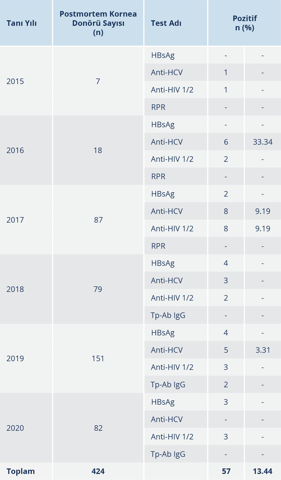 Bulgular: Toplam 424 postmortem kornea donörünün 161 (%37.7)’i kadın, 263 (%62.03)’ü erkekti. Yapılan tarama sonucunda 424 donörün 13 (%3.06)’ünde HBsAg yüksek pozitiflik, 23 (%5.42)’ünde anti-HCV düşük reaktiflik, 19 (%4.48)’unda anti-HIV 1/2 düşük reaktiflik ve 2 (%0.47)’sinde Tp-Ab IgG yüksek reaktiflik saptandı. Düşük reaktivite saptanan donörlerde doğrulama amaçlı yapılan gerçek zamanlı polimeraz zincir reaksiyonu (RT-PCR) testi sonucunda HCV RNA’sı pozitif olan 30 yaşındaki bir kadın donörün, HBsAg yüksek titrede pozitiflik alan 13 donörün ve Tp-Ab IgG test sonucu yüksek reaktiflik saptanan 2 donörün korneaları göz bankası tarafından kullanılamamıştır.