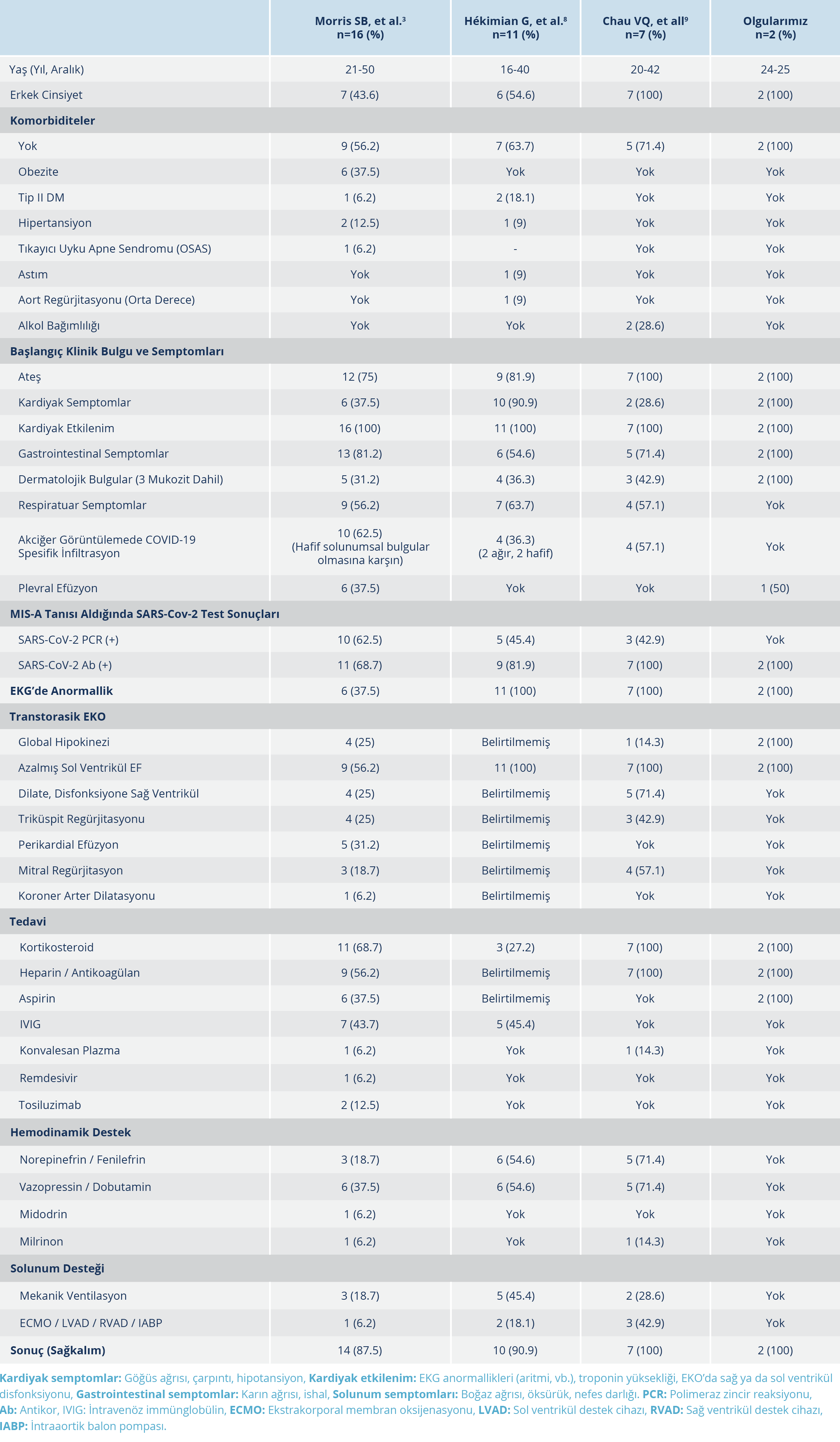 Uluslararası literatürde bildirilen olguların klinik bulguları ve tedavileri Tablo 2’de özetlenmiştir. Fransa, Amerika Birleşik Devletleri, İngiltere ve ülkemizden bildirilen diğer MIS-A olgularında da bizim olgularımıza benzer şekilde ateş, karın ağrısı, ishal, konjonktivit, deri döküntüsü, hipotansiyon ve kardiyak disfonksiyon bildirilmiştir (3, 5, 8, 9). Hékimian ve arkadaşları (8) tarafından bildirilen 11 olgunun tamamında ekokardiyografide sol ventrikül EF orta-ağır düzeyde düşük saptanmış olup ortalama sekiz gün sonra altı hastada tam düzelme, dört hastada EF’de %40 artış tespit edilmiştir. Bizim her iki olgumuzda da yedinci gün EF’de belirgin düzelme, üç hafta sonra tam düzelme saptandı.