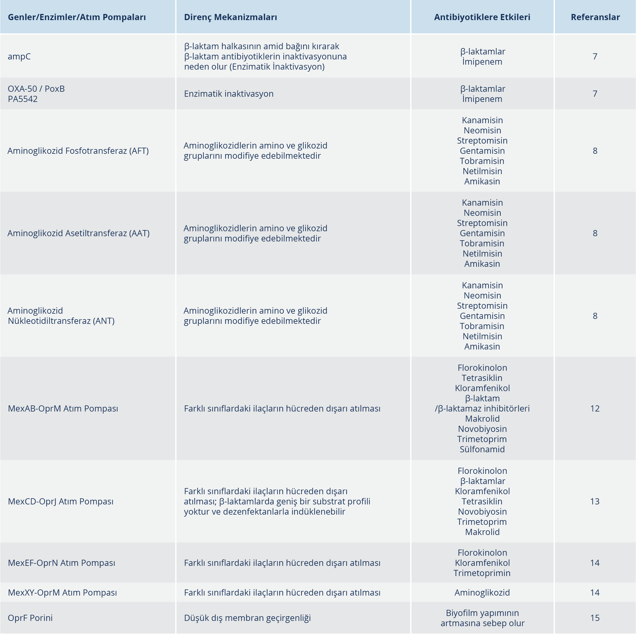 P. aeruginosa’nın diğer Gram-negatif mikroorganizmalara kıyasla doğal rezistom üzerinde büyük etkiye sahip olduğu düşünülen mekanizmaları bulunmaktadır. Bu mekanizmalar; indüklenebilir AmpC sefalosporinaz ekspresyonu gibi antibiyotikleri inaktive eden enzimlerin sentezlenmesi, temel (MexAB-OprM) ve indüklenebilir (MexXY) dışa atım pompası üretimi ve düşük dış membran geçirgenliğidir (Tablo 1) (6).