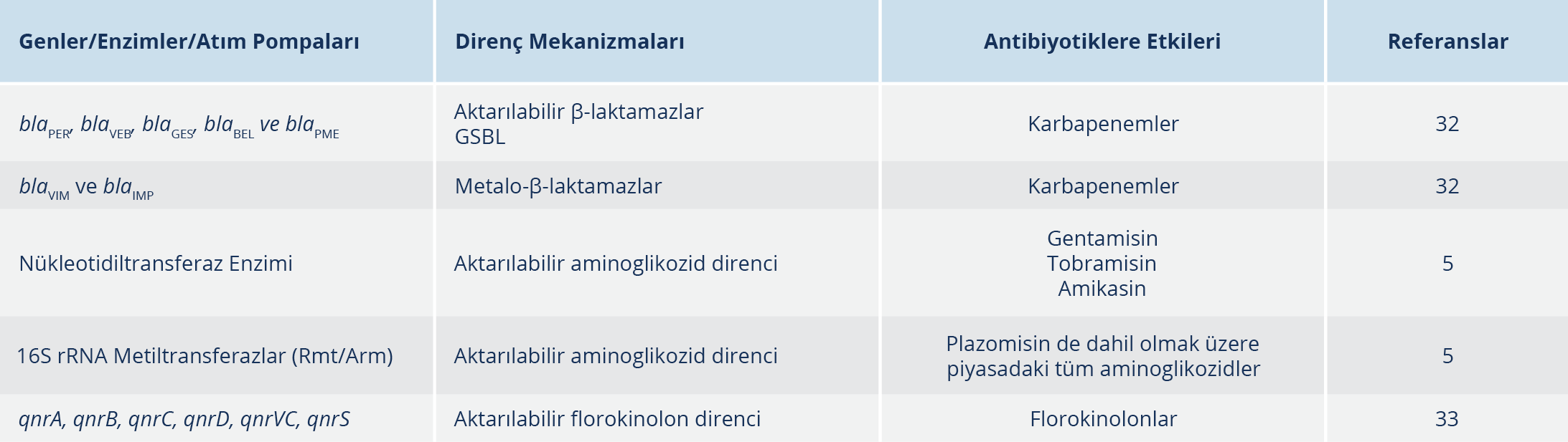 Aktarılabilir aminoglikozid direnci en sık olarak, sınıf 1 integronlarda kodlanan aminoglikozid modifiye eden enzimler tarafından gerçekleşmektedir. P. aeruginosa izolatlarında en yaygın olarak tespit edilen enzimler, gentamisin, tobramisin ve amikasin direncine yol açan nükleotidiltransferaz enzimidir. Bununla birlikte, yeni bir aminoglikozid olan plazomisin de dahil olmak üzere piyasadaki tüm aminoglikozidlere direnç kazandıran 16S rRNA metiltransferazlar (Rmt/Arm) aminoglikozid direncinde rol oynayan önemli tehditlerden biridir (Tablo 3) (5).