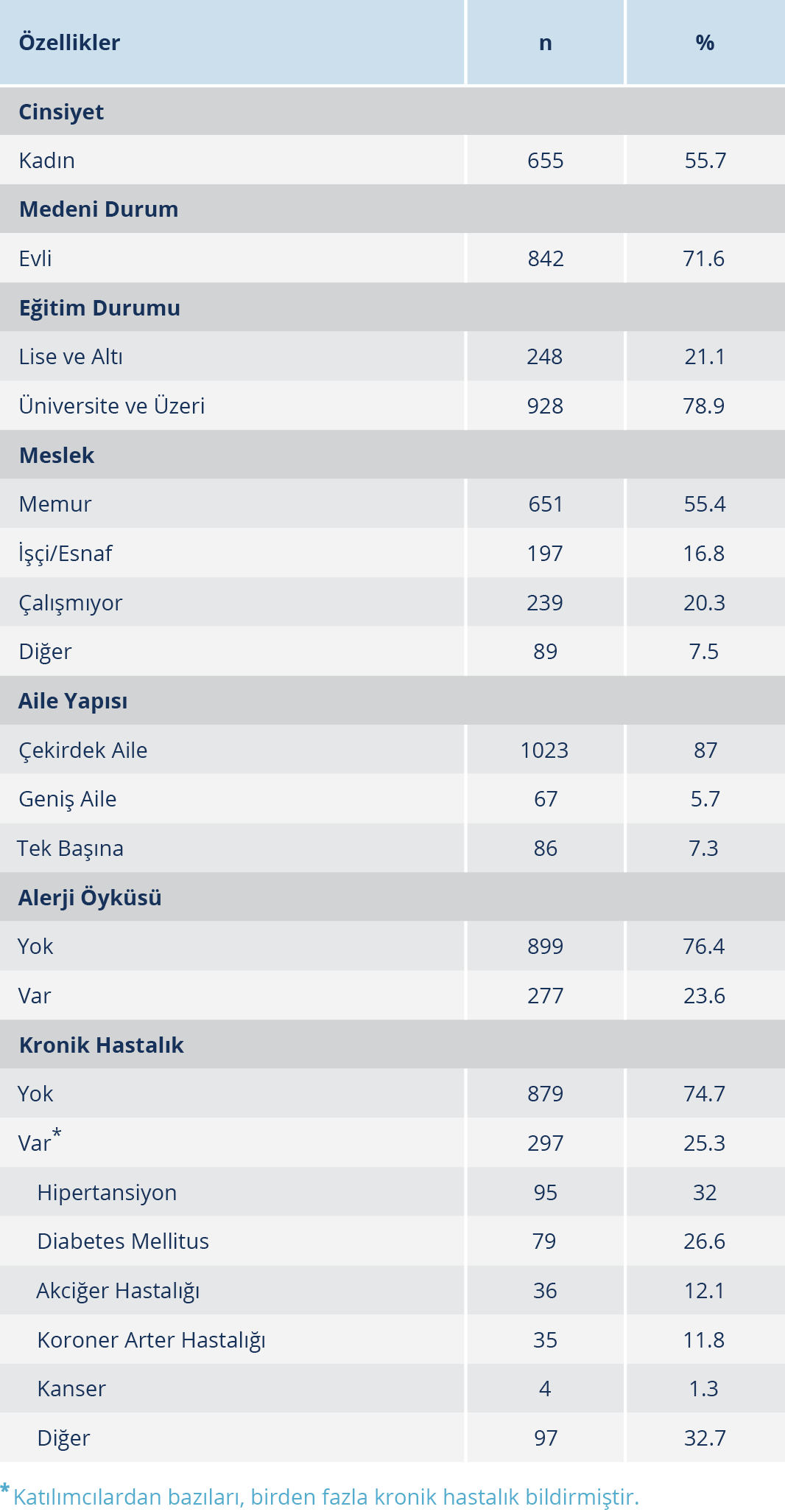Çalışmaya, yaş ortalaması 39.75±11.27 olan ve 655 (%55.7)’i kadın toplam 1176 kişi dâhil edildi. Araştırmaya katılanların 842 (%71.6)’si evli, 928 (%78.9)’i üniversite/lisansüstü mezunuydu. Katılımcıların sosyo-demografik özellikleri, alerji ve kronik hastalık öyküsünün varlığı Tablo 1’de verildi.