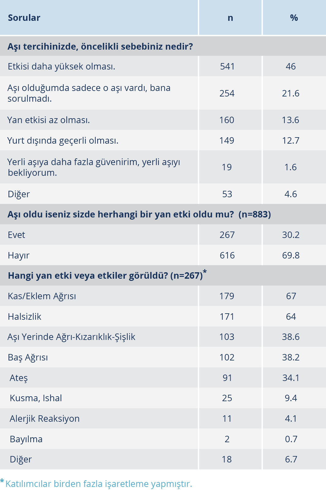 Katılımcılardan 978 (%83.2)’i aşı olduğunu veya sırası geldiğinde aşı olacağını belirtirken, 114 (%9.7)’ü aşı konusunda tereddütü olduğunu, 84 (%7.1)’ü aşı olmayı reddettiğini veya sırası geldiğinde aşı olmayacağını belirtti. Katılımcıların aşı tercihinde öncelikli nedenin hangisi olduğu ve aşı sonrasında karşılaştığı yan etkiler Tablo 3’te verildi.