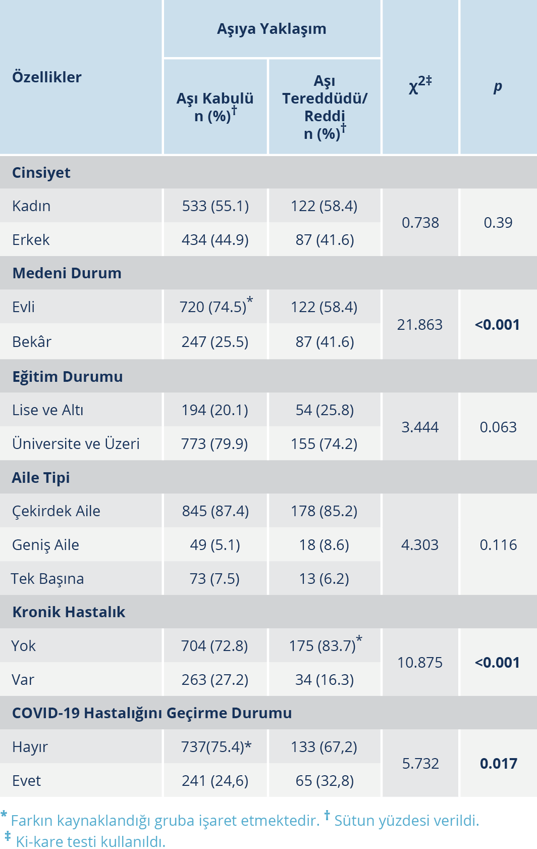 Aşı kabulünün; evli olan katılımcılarda bekâr olanlara göre, COVID-19 hastalığını geçirmeyenlerde geçirenlere göre istatistiksel olarak anlamlı ve yüksek düzeyde olduğu görüldü (p<0.001). Ayrıca kronik hastalığı olmayanlarda aşı tereddütü/reddi kronik hastalığı olanlara göre istatistiksel olarak anlamlı düzeyde ve daha yüksekti (p<0.001) (Tablo 4).