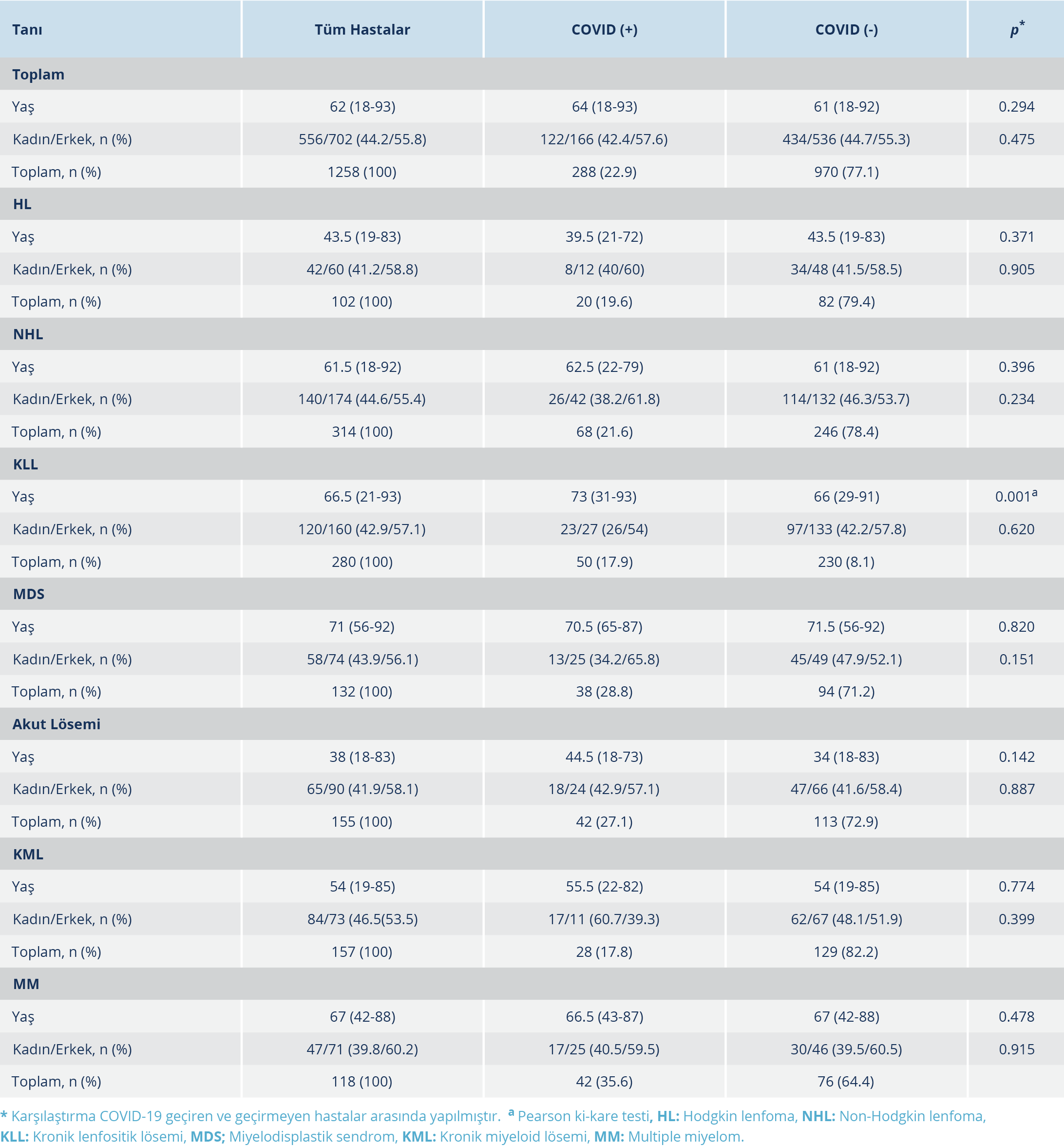 Medyan yaş, COVID (+) grupta 64 (18-93), COVID (-) grupta ise 61 (18-92) bulundu. COVID (+) kronik lenfositer lösemi (KLL) hastalarında medyan yaş, COVID (-) gruba göre anlamlı düzeyde yüksekti (73’e karşın 66; p=0.001). HL hastalarında ise istatistiksel olarak anlamlı düzeyde olmamakla birlikte daha düşüktü (39.5’a karşın 43.5; p=0.371). Diğer hastalıklarda medyan yaş iki grup arasında benzerdi. Tüm hastalar ve tanılar ayrı ayrı değerlendirildiğinde, erkeklerde COVID geçirme sıklığı kadınlara göre daha yüksek olmakla birlikte istatistiksel olarak anlamlı bir fark saptanmadı. Tablo1’de tanılara göre epidemiyolojik özellikler ve COVID-19 öyküleri yer almaktadır.