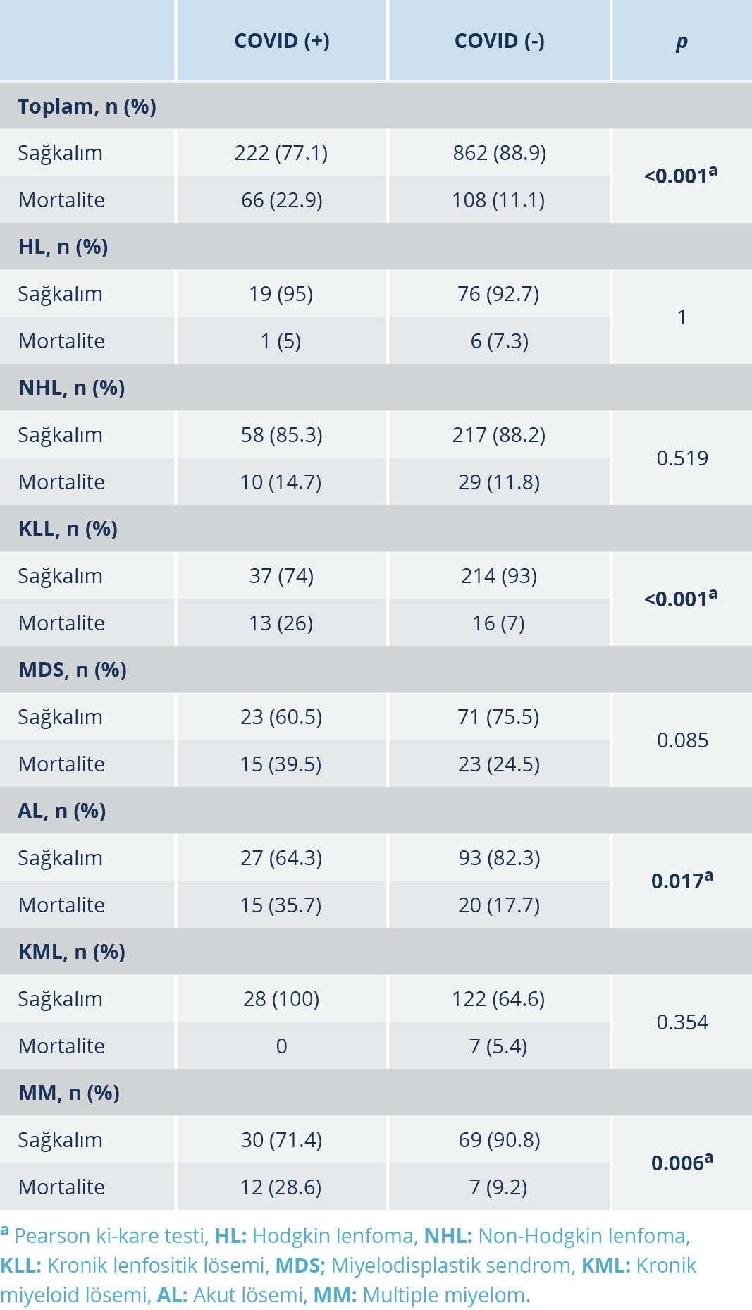 Ölüm oranı COVID (-) hastalarda %11.1 (n=108), COVID (+) hastalarda ise %22.9 (n=66) olup anlamlı düzeyde yüksek saptandı (“odds ratio” [OR]: 2.3; %95 güven aralığı [GA]: 1.67-3.33; p<0.001). Tanılara göre incelendiğinde KLL, akut lösemi (AL) ve MM tanılı COVID (+) hastalarda ölüm sıklığı, COVID (-) hastalara göre anlamlı düzeyde yüksek bulundu. KLL’de %26’ya karşın %7 (OR: 4.6; %95 GA: 2.089-10.572; p<0.001); AL’de %35.7’ye karşın %17.7 (OR: 2.5; %95 GA: 1.167-5.720; p=0.017); MM’da %28.6’ya karşın %9.2 (OR: 3.9; %95 GA: 1.413-11.0; p=0.006) idi. Tanı ve COVID öyküsüne göre ölüm sıklığı Tablo 2’de verilmiştir. COVID (+) hastalarda ölümlerin tamamının COVID-19 ilişkili olduğu tespit edildi. KML hastalarında ölen olmazken, HL tanılı bir hastanın öldüğü saptandı. En yüksek ölüm oranı, %39.5’le miyelodisplastik sendrom (MDS) ve %35.7’yle AL hastalarında görüldü (Tablo 2).