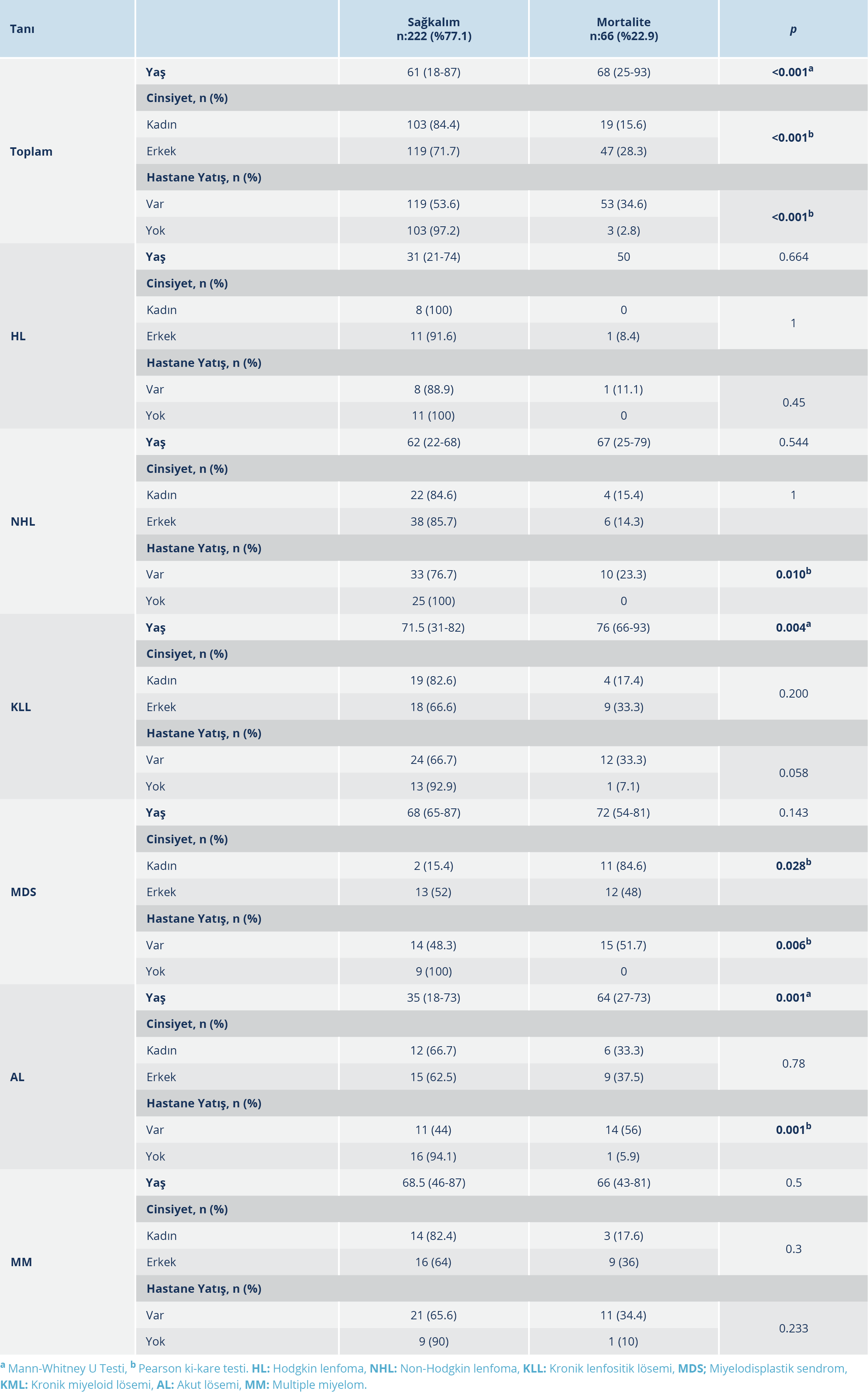 Hayatını kaybeden hastalarda medyan yaş anlamlı olarak yüksek bulundu (68’e karşın 61; p<0.001). Hastalık alt gruplarında ise medyan yaş, ölen KLL (76’ya karşın 71.5; p=0.004) ve AL (64’e karşın 35; p=0.001) hastalarında iyileşenlere göre anlamlı düzeyde yüksekti. İstatistiksel düzeyde anlamlı olmamakla beraber MM dışındaki diğer hastalıklarda da medyan yaş ölen hastalarda daha yüksek bulundu (Tablo 3).