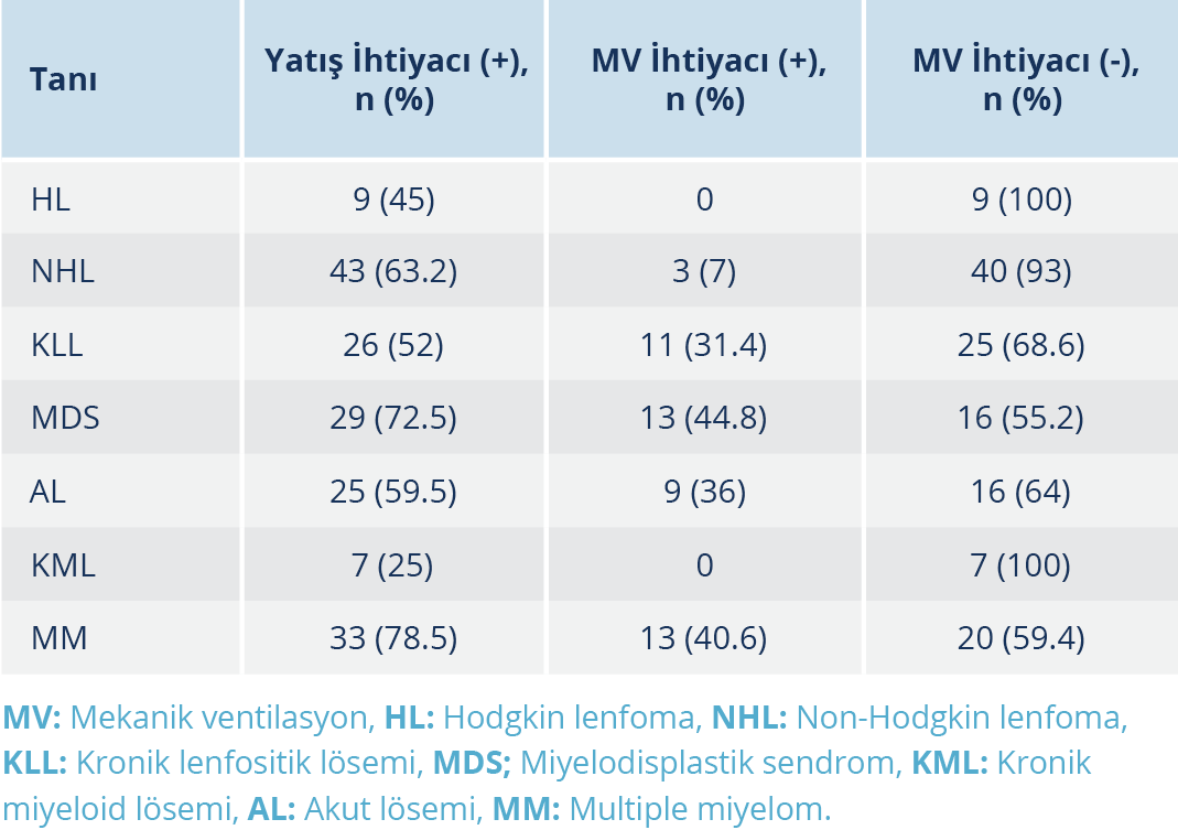 Yatarak tedavi gören hastalarda MV ihtiyacı olan hasta sayısı 49 (%26.9)’du. Bu hastalardan 41 (%83.7)’i, MV ihtiyacı olmayanların ise 22 (%16.8)’si hayatını kaybetmiş olup MV ihtiyacı olanlarda ölüm oranı anlamlı düzeyde yüksek bulundu (OR: 25.9; %95 GA: 10.477-61.542; p<0.001). MV ihtiyacı en yüksek olan hastalar MDS (%44.8) ve AL (%36) hastaları idi. Tablo 4’te COVID (+) hastalarda hastaneye yatış sıklığı ve yatan hastalardaki MV ihtiyacı dağılımı görülmektedir.