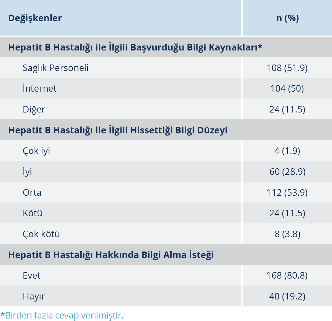Hepatit B hastalarının başvurdukları bilgi kaynakları; %51.9 oranında sağlık personeli, %50 oranında internettir. Hastalıkları hakkında %53.9’ü orta düzeyde bilgi sahibi olduğunu %80.8’i ise hastalığı ile ilgili bilgi alma ihtiyacı hissettiğini ifade etti (Tablo 1).