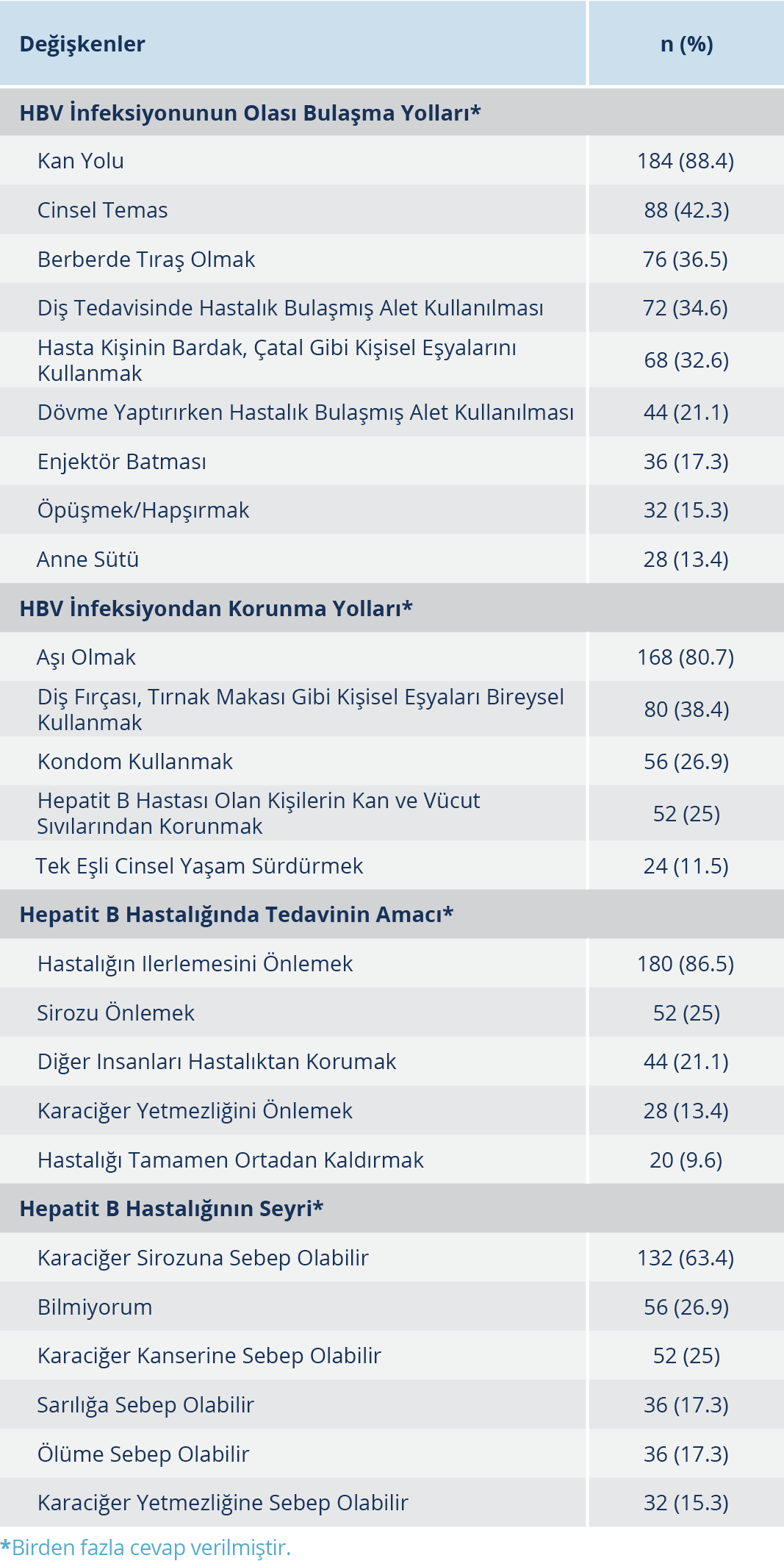 HBV infeksiyonunun bulaşma yolları sorulduğunda; %88.4’ü kan yolu, %42.3’ü cinsel temas, %36.5’i berberde tıraş olma, %34.6’sı diş tedavisinde hastalık bulaşmış alet kullanılması ve %32.6’sı hasta bireyin bardak, çatal gibi kişisel eşyalarının kullanılmasıyla olduğunu ifade etti. Hastaların %80.7’si aşı olmanın, %38.4’ü hasta bireyin diş fırçası, tırnak makası gibi kişisel eşyalarını bireysel olarak kullanmasının ve %26.9’u kondom kullanmanın infeksiyondan korunma yolları olduğunu belirtti. Hastaların %86.5’i hepatit B hastalığının tedavi amacının hastalığın ilerlemesini önlenmek olduğunu ve %63.4’ü hastalığın karaciğer sirozuna sebep olabileceğini ifade etti (Tablo 2).