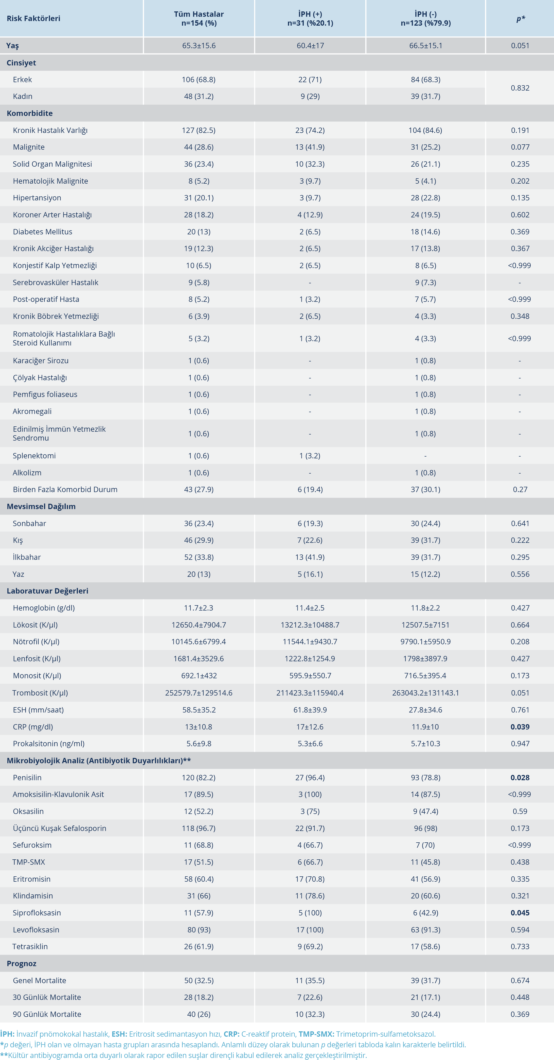 Bulgular: Çalışmaya 154 hasta dahil edildi. Hastaların 106 (%68.8)’sı erkek olup yaş ortalaması 65.3±15.6 yıl (20-94)’dı. Hastalara pnömoni (%79.2), sepsis (%10.4), yara yeri infeksiyonu (%3.2), peritonit (%1.9), epididimoorşit (%3.2), piyelonefrit (%3.2), menenjit (%1.3), beyin apsesi (%0.6), artrit (%0.6), endokardit (%0.6) ve perikardit (%0.6) tanısı konulmuştu. Hastaların ortalama takip süresi 27.8±22.3 aydı. Mortalite oranı %32.5 olarak tespit edildi; 31 (%2.1)’inde İPH saptandı. İnvaziv pnömokok hastalığı olan bireylerde yüksek C-reaktif protein (CRP) düzeyi (>14.4 mg/dl), penisilin ve siprofloksasin duyarlılığı anlamlı olarak daha yüksek bulundu (p=0.039, p=0.028 ve p=0.045). İPH tanılı bireylerden elde edilen pnömokok suşları, invazif hastalık yapmayan pnömokok suşlarına kıyasla penisiline ve siprofloksasine daha duyarlı bulundu (%96.4 ve %78.8, p=0.028; %100 ve %42.9, p=0.045).