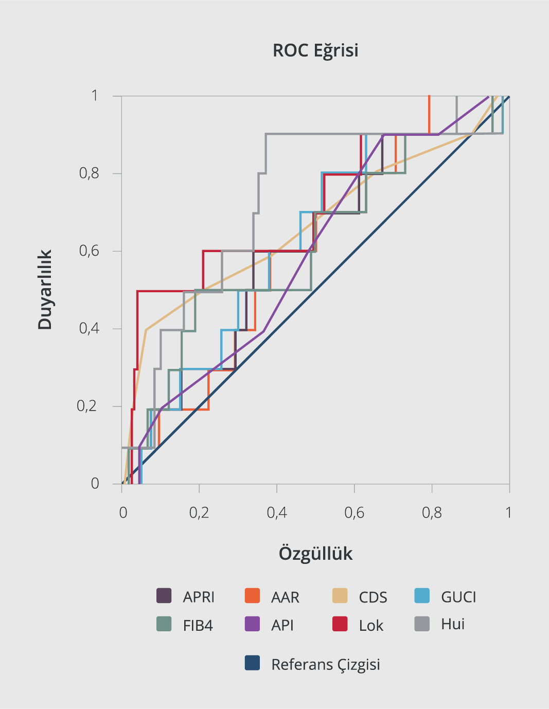 Sonuçlar: Çalışmamızda, birçok belirteç başarılı olmakla birlikte AUROC değerlerinin birbirlerinden anlamlı düzeyde üstünlüklerinin olmadığı görüldü ve tek başlarına karaciğer biyopsisine alternatif olamayacakları saptandı.
