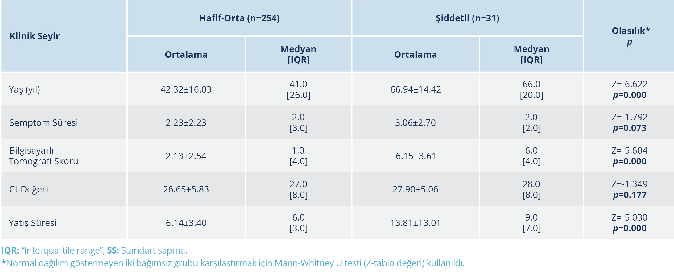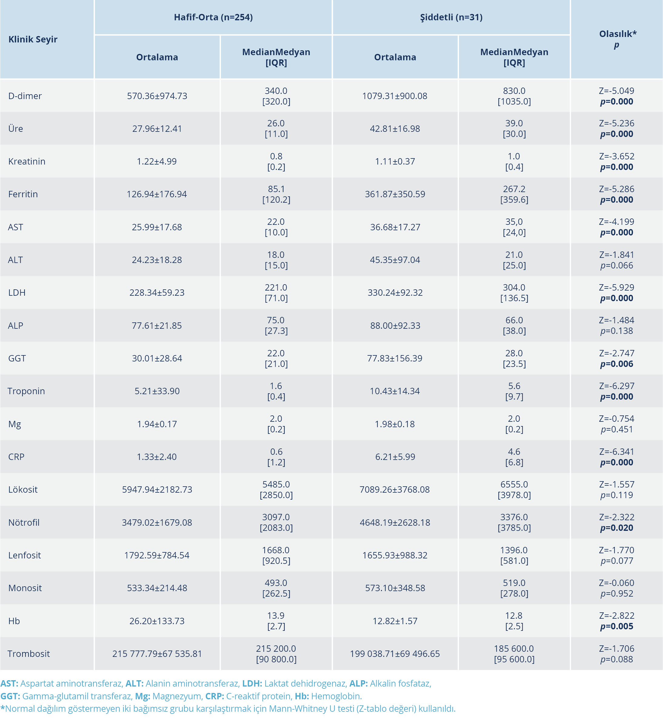 Bulgular: Kohortun tamamı 285 hasta olup 254’ü hafif-orta klinik seyir gösterirken, 31’i şiddetli klinikle seyrediyordu. İstatistiksel analizler, iki grup arasında tanı anına kadar geçen semptom süresinin ve viral yükün benzer olduğunu gösterdi (p>0.05). İki grubun tek değişkenli analizinde; yaş, hastanede kalış süresi, bilgisayarlı tomografi skorları, serum D-dimer, üre, kreatinin, ferritin, aspartat aminotransferaz (AST), laktat dehidrogenaz (LDH), gama-glutamil transferaz (GGT), troponin, C-reaktif protein (CRP) ve nötrofil değerleri açısından anlamlı düzeyde farklılık tespit edildi. Bununla birlikte çok değişkenli lojistik regresyon analizinde; yalnızca ferritin, CRP ve LDH’nin şiddetli klinik seyir ile pozitif korelasyon gösterdiği tespit edildi (p<0.05).