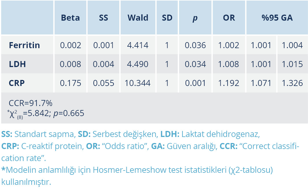 Çalışmaya 285 hasta dahil edilmiş olup 254’ünde hafif-orta klinik seyir, 31’inde ise şiddetli seyir izlendi. Cinsiyet dağılımları açısından iki hasta grubu benzerdi; ilk grubun %53.1’i, ikinci grubun %51.6’sı kadındı. SARS-CoV-2 viral yükü ve semptom süresi açısından da gruplar benzerdi (p>0.05) (Tablo 1). Ancak bu iki grup arasında hasta yaşı ve hastanede yatış süreleri açısından anlamlı düzeyde fark saptandı (p<0.05) (Tablo 1). Şiddetli klinik seyri olan hastalarda akciğer BT skorları, D-dimer, üre, kreatinin, ferritin, AST, LDH, GGT, troponin, CRP, nötrofil değerleri hafif-orta seyirli olanlara göre anlamlı düzeyde yüksekti (p<0.05) (Tablo 2). Tek değişkenli analize göre klinik seyri etkileyen faktörler, lojistik regresyon analizi ile de değerlendirildi. Bu analiz, artan ferritin, LDH ve CRP düzeylerinin şiddetli klinik seyirle ilişkili olduğunu ortaya koydu (p<0.05, “odds ratio” (OR)=1.002, p<0.05, OR=1.002, p<0.05, OR=1.192) (Tablo 3).