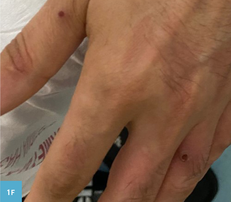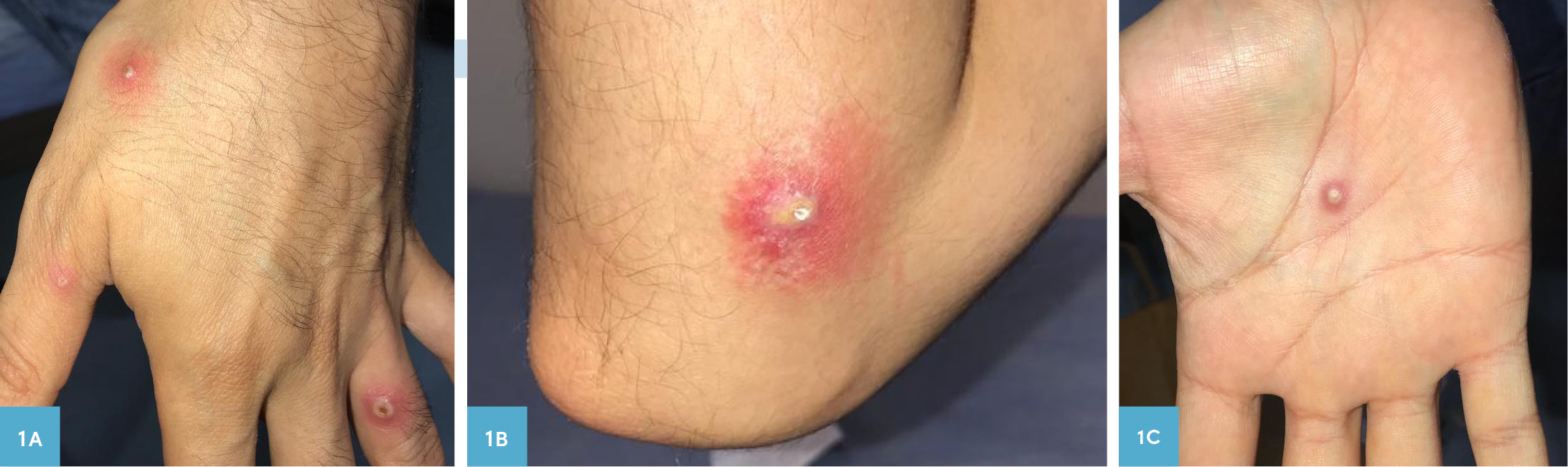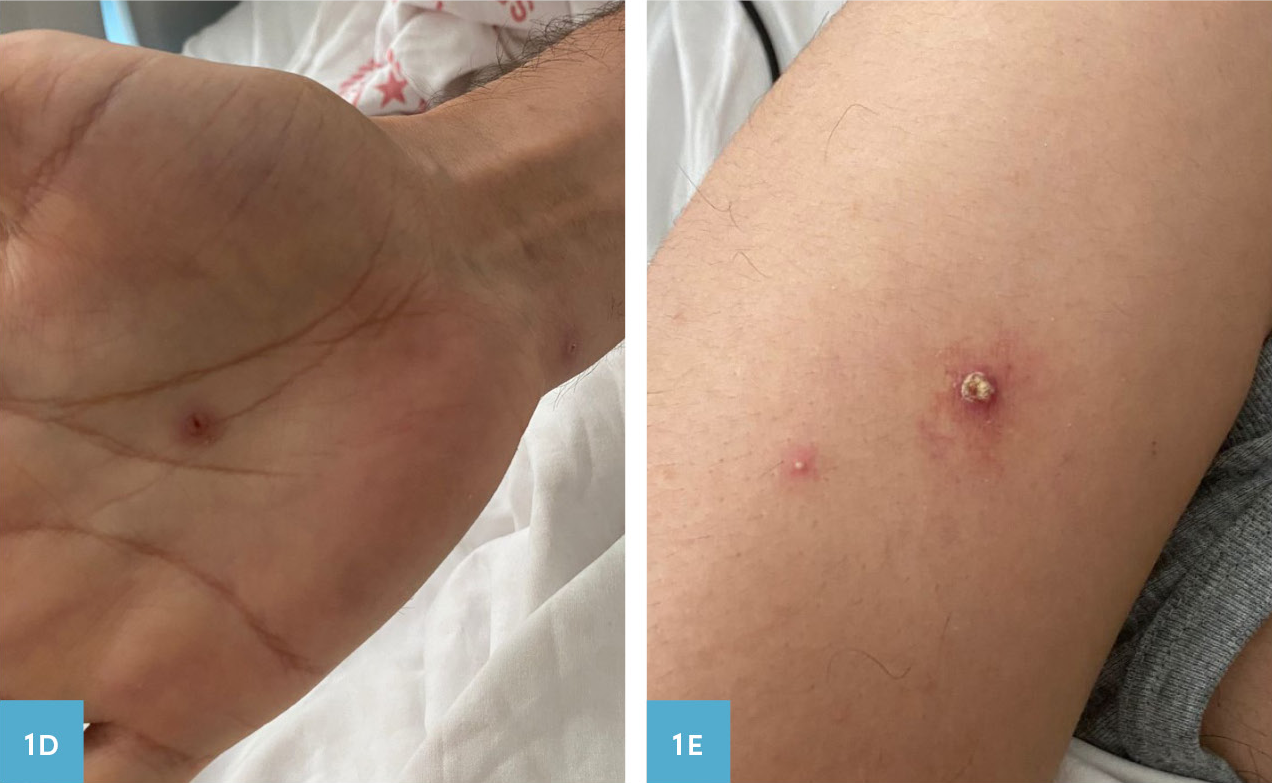 Ellerde, gövdede, alında ve anal bölgede yer alan püstüler döküntü şikâyeti ile polikliniğimize başvuran 37 yaşındaki erkek hastanın şikayetleri 4-5 gün önce başlamıştı. İmmün yetersizlik ile takipli olan hastanın yaklaşık 20 gün öncesine dayanan korunmasız cinsel temas öyküsü mevcuttu. Seyahat öyküsü ve çevresinde benzer şikayetleri olan kişi yoktu. Döküntülerin başlangıcında yaklaşık bir gün süren ateş şikâyeti ve aynı zamanda başlayarak eşlik eden karın ağrısı, boğaz ağrısı ve iştahsızlık şikayetleri mevcuttu. Döküntünün özellikleri; tüm vücutta yaygın, püstüler ve kaşıntılı olmasıydı. Ayrıca anal bölgedeki lezyonlara ağrı da eşlik etmekteydi. Fizik muayenesinde; ateş 37.2 °C, kan basıncı 110/70 mmHg, nabız 85/dakika olarak ölçüldü. Her iki elin dorsal ve plantar yüzünde, frontal bölgede, anal bölgede, sağ omuz ve karın bölgesinde püstüler lezyonlar görüldü (Resim 1A, 1B, 1C). Lezyonların her birinin farklı evrede olduğu tespit edildi. Frontal bölgedeki lezyon kaşıntı nedeniyle hemorajik akıntılıydı. Dudakta veziküler döküntü olup diğer sistem muayeneleri doğaldı. Laboratuvar tetkiklerinde; lökosit (WBC) 9570/mm3, lenfosit (Lym) 3230/mm3, hemoglobin (Hgb) 14.4 gr/dl, C-reaktif protein (CRP) 15 mg/lt, anti-varisella zoster virus (VZV) immünoglobülin M (IgM) negatif, anti-VZV immünoglobülin G (IgG) pozitif, anti-herpes simpleks virus(HSV) tip 1/2 IgM negatif, anti-HSV tip 1/2 IgG pozitif, Treponema pallidum hemaglutinasyon (TPHA) testi pozitif, “Venereal Disease Research Laboratory 1(VDRL)” testi negatifti. Hasta daha önce sifilis nedeniyle tedavi almıştı. Diğer biyokimyasal testler normal sınırlarda bulundu.