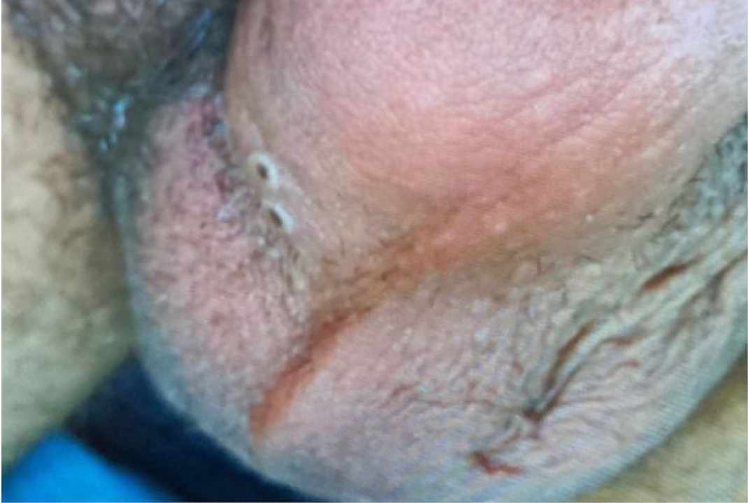 Fizik muayenede; tansiyon 110/70 mmHg, oda havasında ölçülen SpO2 %99, ateş 36.9 °C, nabız 87/dk olarak ölçüldü. Penis ve skrotumda yaygın multiple göbekli püstüler lezyonlar ile diffüz ödem ve hiperemi (Resim 2), bilateral inguinal bölgelerde ise palpasyonla ağrılı, sert kıvamda, yaklaşık çapları 1cm büyüklüğünde lenfadenopatiler mevcuttu.