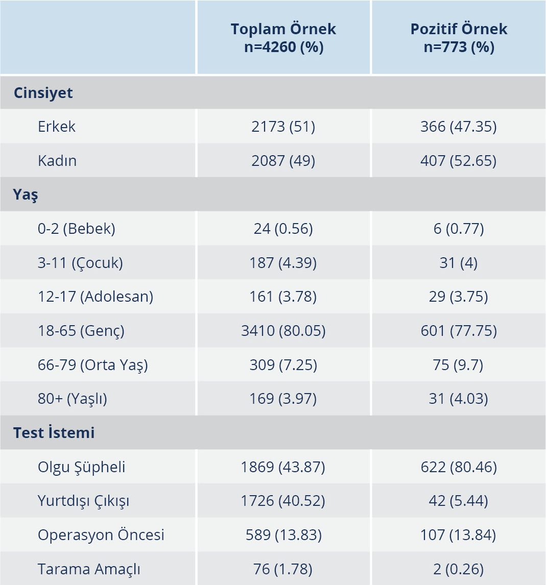 Nisan 2021-31 Aralık 2021 tarihleri arasında COVID-19 PCR test istemiyle klinik örnekleri gönderilen 4260 hasta çalışmaya dahil edildi. Örnekleri değerlendirilen hastaların 2173 (%51)’ü erkek 2087 (%49)’si kadındı. Nazofarengeal sürüntü, bronkoalveolar lavaj, trakeal aspirat örnekleri viral nükleik asit tamponu (vNAT) ile muamele edilerek viral nükleik asit izolasyonu gerçekleştirildi.
