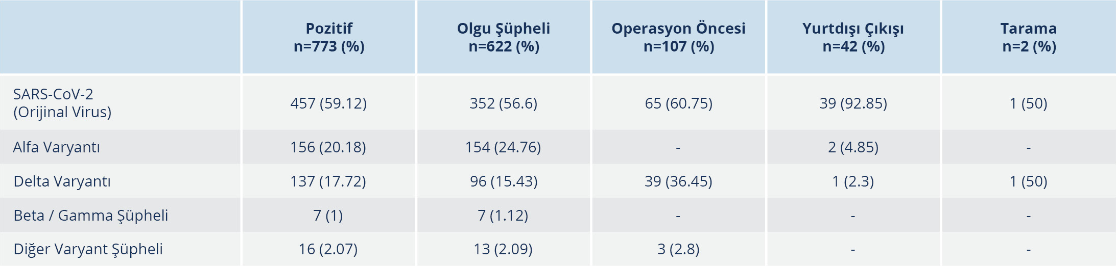 Çalışmaya dahil edilen 4260 hastanın yaş ortalaması 39.82±18.98 (medyan=36) olup bunların 2173 (%51)’ü erkek, 2087 (%49)’si kadındı. Örneklerin 773 (%18.14)’ünde SARS-CoV-2 RT-PCR pozitifliği, pozitif örneklerin 316 (%40.88)’sında ise farklı SARS-CoV-2 varyantları saptandı. PCR testi pozitif hastaların 407 (%52.65)’si kadın, 366 (%47.35)’sı erkek, yaş ortalaması 41.71±19.32 idi. Hastaların 457 (%59.12)’sinde herhangi bir varyant saptanmazken 156 (%20.18)’sında alfa, 137 (%17.72)’sinde ise delta varyantı saptandı. Beta, gamma ve diğer şüpheli varyantların yayılımının görece düşük oranlarda kaldığı görüldü (Tablo 1, 2).
