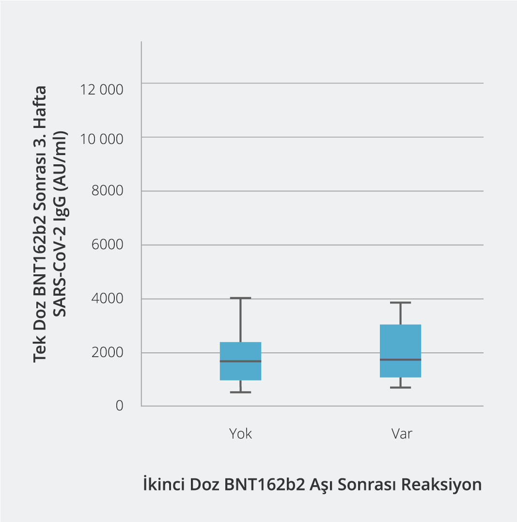 Sağlık çalışanlarının iki doz CoronaVac aşısı sonrası 4. aydaki SARS-CoV-2 IgG titreleri değerlendirildiğinde, seropozitiflik oranı %95 iken (minimum:10, maksimum: 14 739.5; medyan: 292.10), bir doz BNT162b2 hatırlatma dozu sonrası seropozitiflik oranı %100 (minimum:151.10, maksimum: 117 170.40; medyan: 17 625.3) olarak bulundu.