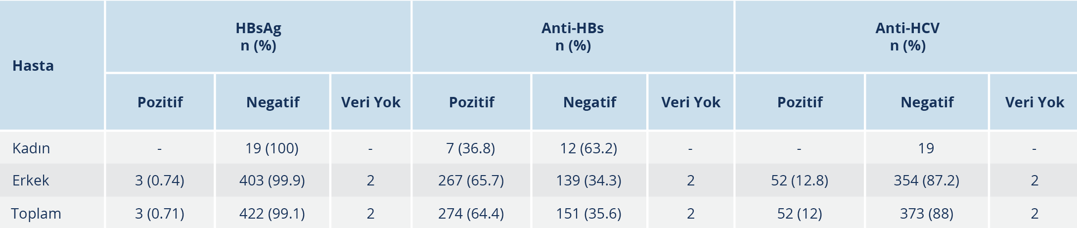 Çalışmaya, 2021-2022 yılları arasında Şanlıurfa AMATEM kliniğinde ayaktan ve yatarak takip edilen 18 yaş üzeri 427 hasta dahil edildi. Hastaların 408 (%95.6)’i erkek ve 19 (%4.4)’u kadındı. Yaş ortalaması 27.03±5.5 yıl olup erkeklerin 27.06±5.5 ve kadınların 26.4±7.2 idi. Hastaların madde kullanım bozukluklarında 315 (%73.8) kişi ile en fazla opioid kullanımı göze çarparken bunu 227 (%53.2) kişi ile metamfetamin kullanımı takip ediyordu (Tablo 1). Hastaların 315 (%73.8)’inde damar içi madde kullanımı olup 307 (%97.5)’si erkek ve 8 (%2.5)’i kadındı. Damar içi madde kullanımı olan hastaların tamamında opioid kullanımı tespit edildi (Tablo 2). Hastaların 425 (%99.5)’inde laboratuvar tetkiklerinin yapıldığı tespit edildi. HBsAg pozitifliği 3 (%0.71) erkek hastada vardı. Anti-HBs pozitifliği ise %64.4 olup bu oran erkeklerde (%65.7) kadınlara (%36.8) göre belirgin olarak yüksekti. Anti-HCV pozitifliği 52 (%12) erkek hastada saptandı. Anti-HIV testinin 425 ve VDRL testinin ise 207 hastadan istenmiş olduğu tespit edildi ancak test pozitifliğine rastlanmadı (Tablo 3). Anti-HCV pozitifliği olan 52 hastanın kullandıkları madde türlerine bakıldığında 49 (%94.23) hasta ile en fazla opioid kullanımı olduğu görülürken %51.92 oranıyla metamfetamin sık kullanılan bir diğer maddeydi (Tablo 4). Metamfetaminin daha çok inhalasyon yoluyla kullanıldığı öğrenilirken üç hastada (iki hasta sadece metamfetamin, bir hasta metamfetamin ve esrar kullanımı) damar içi madde kullanımı olmadan anti-HCV pozitifliği tespit edildi.