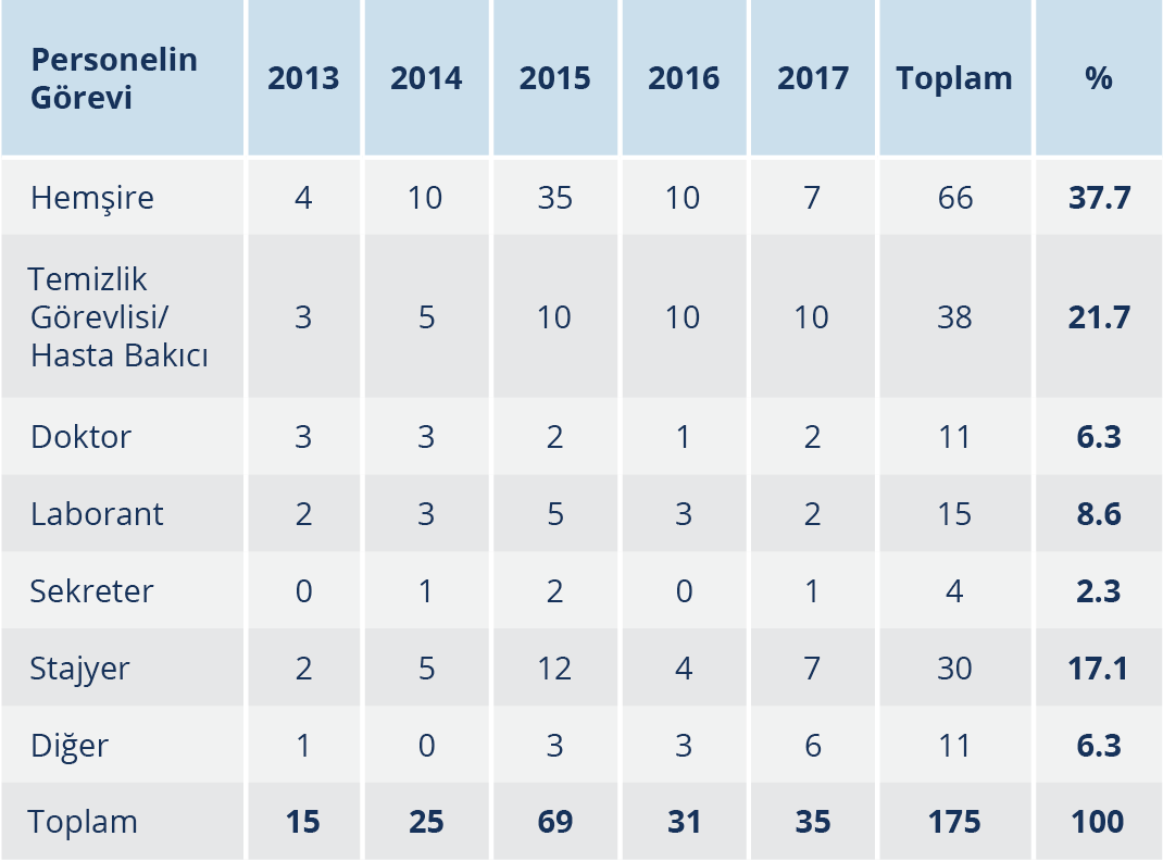EKK’ye başvuran personelin sayısı 175 olup yaş ortalaması 31.5±8 yıldı. Olguların %58.5’i erkek, %41.5’i kadındı. En yüksek sayıdaki olgu grubu 66 (%37.7) kişi ile hemşirelerdi; bunu 38 (%21.7) kişi ile temizlik görevlileri/hasta bakıcılar ve 30 kişi (%17.1) ile stajyerler izliyordu. En fazla sayıda yaralanma ameliyathanelerde [39 (%22.3)], acil serviste [33 (%18.8)], yoğun bakım ünitesinde [32 (%18.3)] ve cerrahi servislerde [22 (%12.6)] görüldü (Tablo 1-3).