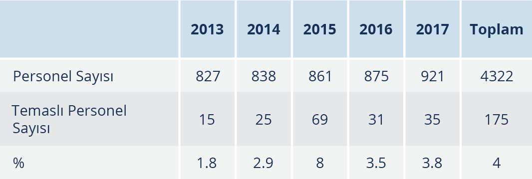 Çalışmamızda dikkat çeken bir diğer nokta, 2015 yılındaki yaralanma nedeniyle başvuruların diğer yıllara göre oldukça yüksek olmasıydı. Yıllara göre sağlık çalışanlarının sayıları ve çalışma saatleri incelendiğinde anlamlı düzeyde bir farklılık olmadığı görüldü (Tablo 3). 2015 yılının ilk üç aylık döneminde başvuru sayısı 45’ti; EKK’ye yapılan toplam müracaat sayısı o yıl içinde yapılan tüm müracaatların %65.2’sini oluşturuyordu. Sebebi incelendiğinde; ilgili dönemde hastanemizin acil servisine başvuran bir hastanın HIV pozitif olduğu ve öz geçmiş/kronik hastalıklar formu doldurulurken bu durumu sağlık çalışanlarına söylemediği, anti-HIV testinin sonucunun pozitif olduğunun anlaşılması üzerine söz konusu hastanın vücut sıvıları ile temasının olduğunu söyleyen 10 sağlık çalışanının EKK’ye müracaat ettiği anlaşıldı. Ayrıca bu olay nedeniyle aynı üç aylık periyotta durumun ciddiyetinin farkına varılması ve tüm riskli temaslarda sağlık çalışanlarının komiteye müracaat etmeleri sonucu kayıtların arttığı düşünüldü. Bu da bize diğer yıllarda temaslı sağlık çalışanı sayısının gerçekte daha fazla olabileceğini düşündürdü. Anti-HIV testi pozitif hasta ile temasının olduğunu belirten sağlık çalışanları ile yapılan görüşmelerde bazı çalışanların hastanın acil şartlarda beyin cerrahları tarafından ameliyata alındığını ve anti-HIV sonucunun pozitif olduğunu sonradan öğrendiklerini bu nedenle KKE kullanımında daha dikkatsiz davrandıklarını söylediler. Hastanın vücut sıvıları ile teması olduğunu düşünen 10 sağlık çalışanı başvurusundan sekizi riskli kabul edildi. Tek bir hastadan kaynaklı temaslı sayısının yüksek olması düşündürücüydü ancak çalışanın beyanı temel alındığından görüşmelerdeki riskli olarak beyan edilen durumlar kayıt altına alındı. Riskli kabul edilmeyen iki kişi hastayı ameliyat eden beyin cerrahisi doktorlarıydı; KKE’leri eksiksiz kullandıkları, bulaşma olmadığı ve bu nedenle temaslarının riskli kabul edilmediği görüldü. Riskli kabul edilenlerden ikisi laboranttı; hastadan alınan kanları çalışırken eldiven giymediklerini ve kan ile temasları olduğunu bildirmişlerdi. Laborantlar, ellerindeki cilt bütünlüğünün bozuk olduğu gerekçesiyle riskli temaslı kabul edilmişti. Riskli kabul edilen iki ameliyathane hemşiresi operasyon esnasında gözlük kullanmadıklarını ve gözlerine kan sıçradığını beyan etmişti; kalan 4 kişi yine hemşire olup ameliyat esnasında KKE’leri uygun olarak kullandıkları halde gözlerine kan sıçradığını bildirmişti. Gözlük kullanmayan iki ameliyathane hemşiresi ameliyat esnasında gözlüğün buğulandığını bu nedenle gözlük kullanmamayı tercih ettiklerini ifade etmişti. Gözlük kullanan hemşireler ise ameliyat esnasında gözlüklerinin alt kısmından gözlerine kan sıçradığını bildirmişti.