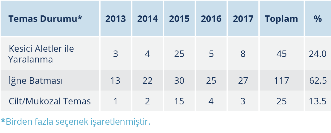 - Bozkurt S, Kökoğlu ÖF, Yanıt F, et al. [Needle sticks and injuries due to surgical instruments in health care providers]. Dicle Tıp Dergisi. 2013;40(3):449-52. Turkish.