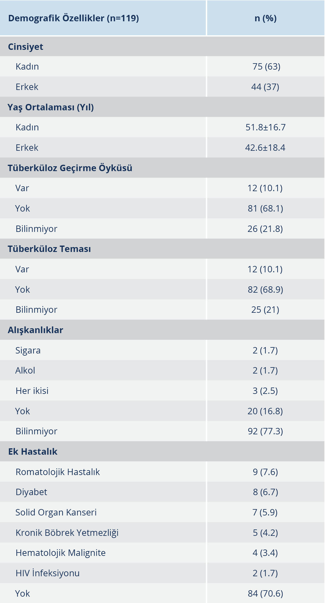 Olguların, 81 (%68.1)’inin tüberküloz geçirme öyküsü ve 82 (%68.9)’sinin tüberkülozlu kişilerle temas bilgisi yoktu; 84 (%70.6)’ünde eşlik eden ek hastalık tespit edilmedi (Tablo 1).