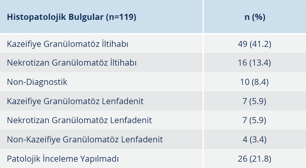 Olguların 93’ünden alınan örneklerde patolojik inceleme yapılmış olup en sık karşılaşılan bulgu %41.2 oranıyla kazeifiye granülomatöz iltihaptır (%41.2) (Tablo 5).
