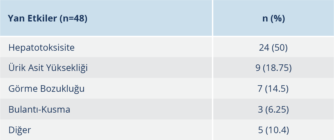 Tüberküloz tedavisi sırasında en sık rastlanan yan etki hepatotoksisitedir. INH, RIF ve PZA hepatotoksik ilaçlar olup birlikte kullanıldığında yan etki riski de artmaktadır. PZA, böbrek tubuluslarında ürik asit sekresyonunu engellediği için ürik asit seviyesi yükselir. Çalışmamızda, tedaviye bağlı yan etki 48 (%40) olguda tespit edildi. En sık görülen yan etki, %50 (24/48) oranıyla hepatotoksisite olup bunu %18.5 ile ürik asit artışı izledi.