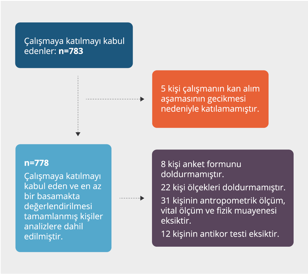 Başlangıç vizitlerinin yapıldığı ilk beş haftalık dönemde çalışmaya katılmayı kabul edenlerin sayısı 783’tür; çalışmanın tüm basamaklarını tamamlayanların yüzdesi ise 92.4’tür. Hematolojik ve biyokimyasal analizler, periyodik izlem ve muayeneler sürdürülemeyeceği için son sınıf öğrencilerine yapılmadı. Biyokimya testleri için 545, tam kan sayımı ve 25-OH vitamin D için 537, HbA1c için 538 katılımcının kan örneği değerlendirildi (Şekil 2).