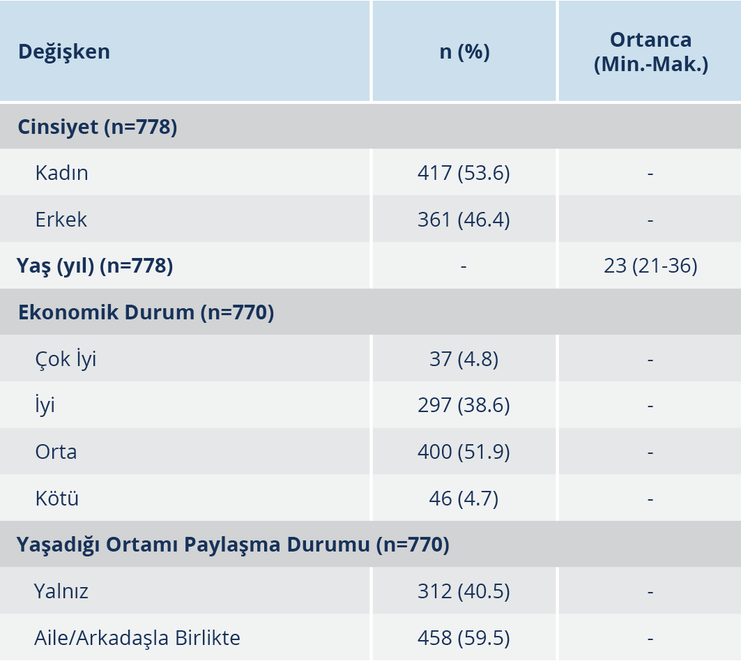 Katılımcıların %53.6’sı kadındı; ortanca yaş 23 (21-36) olarak tespit edildi.  Cevap verenlerin %38.6’sı ailelerinin sosyoekonomik durumunu “iyi”, %51.9’u “orta” olarak belirtti. Katılımcıların yaklaşık %60’ı evde veya yurtta yaşadığı ortamı bir veya daha fazla kişi ile paylaşmaktaydı (Tablo 1).