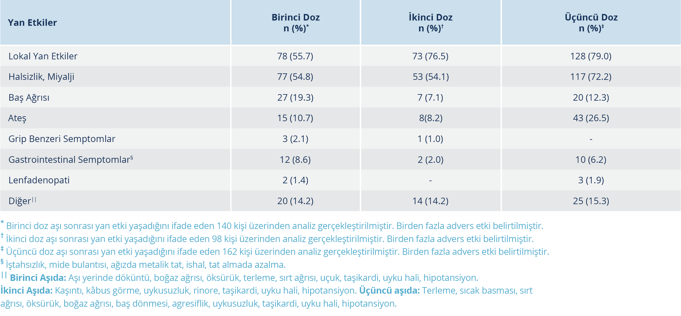 Katılımcılara aşı sonrası deneyimlenen advers etkiler doz özelinde soruldu. Aşı sonrası en yaygın belirtilen lokal yan etkiler (aşı yerinde ve kolda ağrı, lokal ısı artışı ve kızarıklık) ve takiben halsizlik, miyaljidir. Doz sayısı ile advers etki arasında pozitif ilişki saptandı (Tablo 4).
