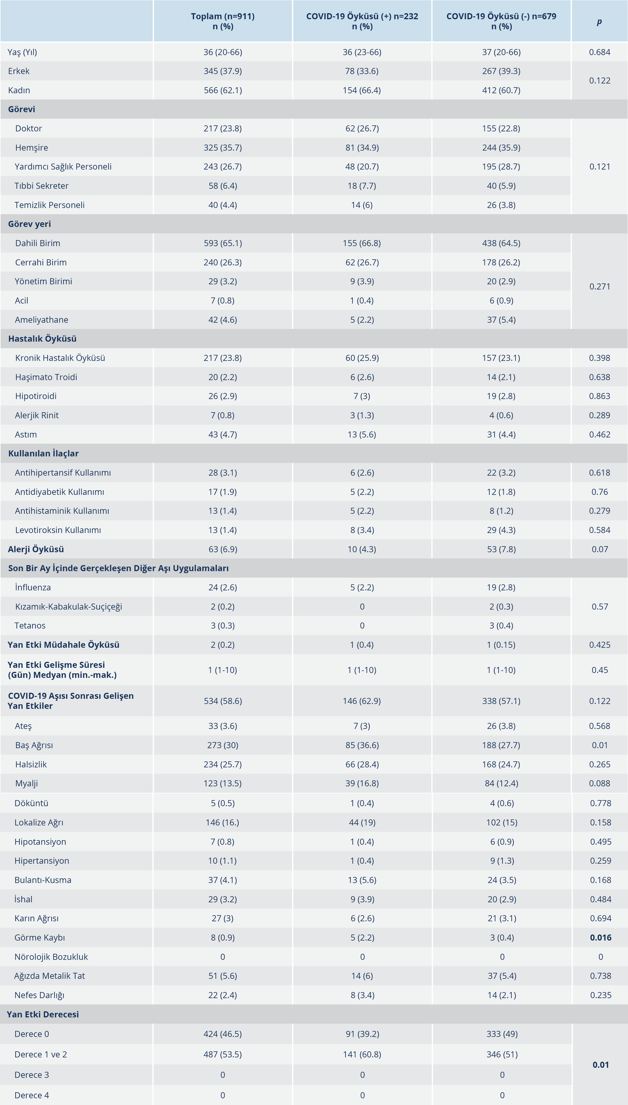 Çalışmaya, CoronaVac aşısı (Sinovac Life Sciences, Pekin, Çin) uygulanan 911 gönüllü sağlık çalışanı dâhil edildi. COVID-19 geçirme öyküsü olan katılımcı sayısı 232 (%25.5) olup 679 (%74.5) kişinin COVID-19 öyküsü yoktu. Söz konusu 232 kişinin 22’sinin COVID-19 nedeniyle yatarak tedavi aldığı öğrenildi. COVID-19 geçiren ve geçirmeyen katılımcı gruplarının epidemiyolojik özellikleri ve gelişen istenmeyen etkiler Tablo 1’de verildi.