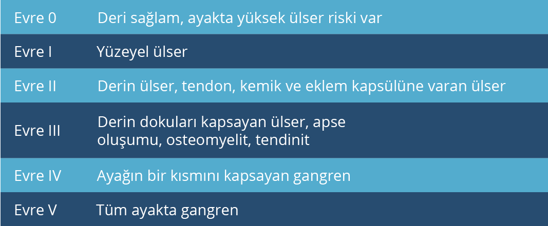 Meggitt-Wagner sınıflaması 1976’da Meggitt tarafından geliştirilmiş ve 1981’de Wagner tarafından düzenlenmiştir. Sınıflandırma, sıfırdan beşe kadar sayısal bir ölçek kullanarak yara derinliğinin yanı sıra infeksiyon ve gangren varlığının tespit edilmesine izin verir (Şekil 1) (14).
