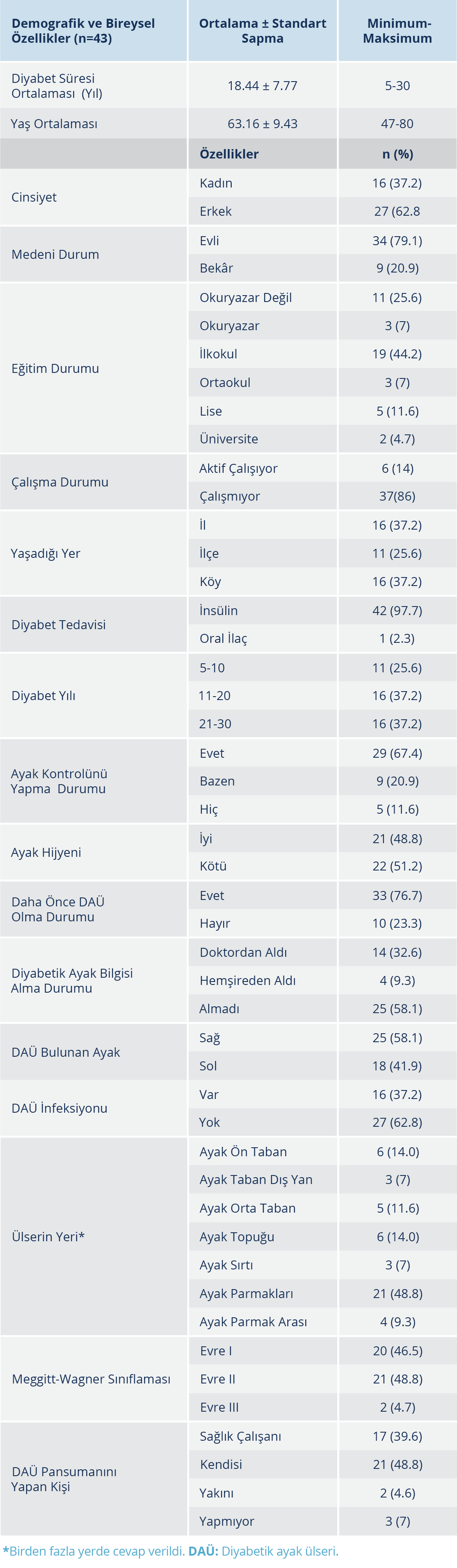 Çalışmada yer alan hastaların; %63’ü erkek ve %79’u evli olup %37’si il merkezinde yaşamaktaydı. Yaş ortalaması 63.16±9.43 yıl ve diyabet yılı ortalaması 18.44±7.77 yıldı; yaklaşık %75’i 10 yıldan uzun süredir diyabet hastasıydı. Ayak hijyeni %51’inde kötüydü ve %58’inin diyabetik ayak bakımı hakkında bilgisi yoktu. Daha önce DAÜ geçirenlerin oranı %77 idi. Mevcut DAÜ’nün %58’i sağ ayakta, %49’u parmaklardaydı; Meggitt-Wagner sınıflamasına göre %49’u evre II’de derin ve yumuşak dokuda, %4.7’si evre III’te olup bunlarda osteomiyelit bulunmaktaydı. Kültür sonucuna göre hastaların %37.2’sinde diyabetik ayak infeksiyonu (DAİ) bulunmaktaydı ve %49’u ülser pansumanını kendisi yapıyordu (Tablo 1).