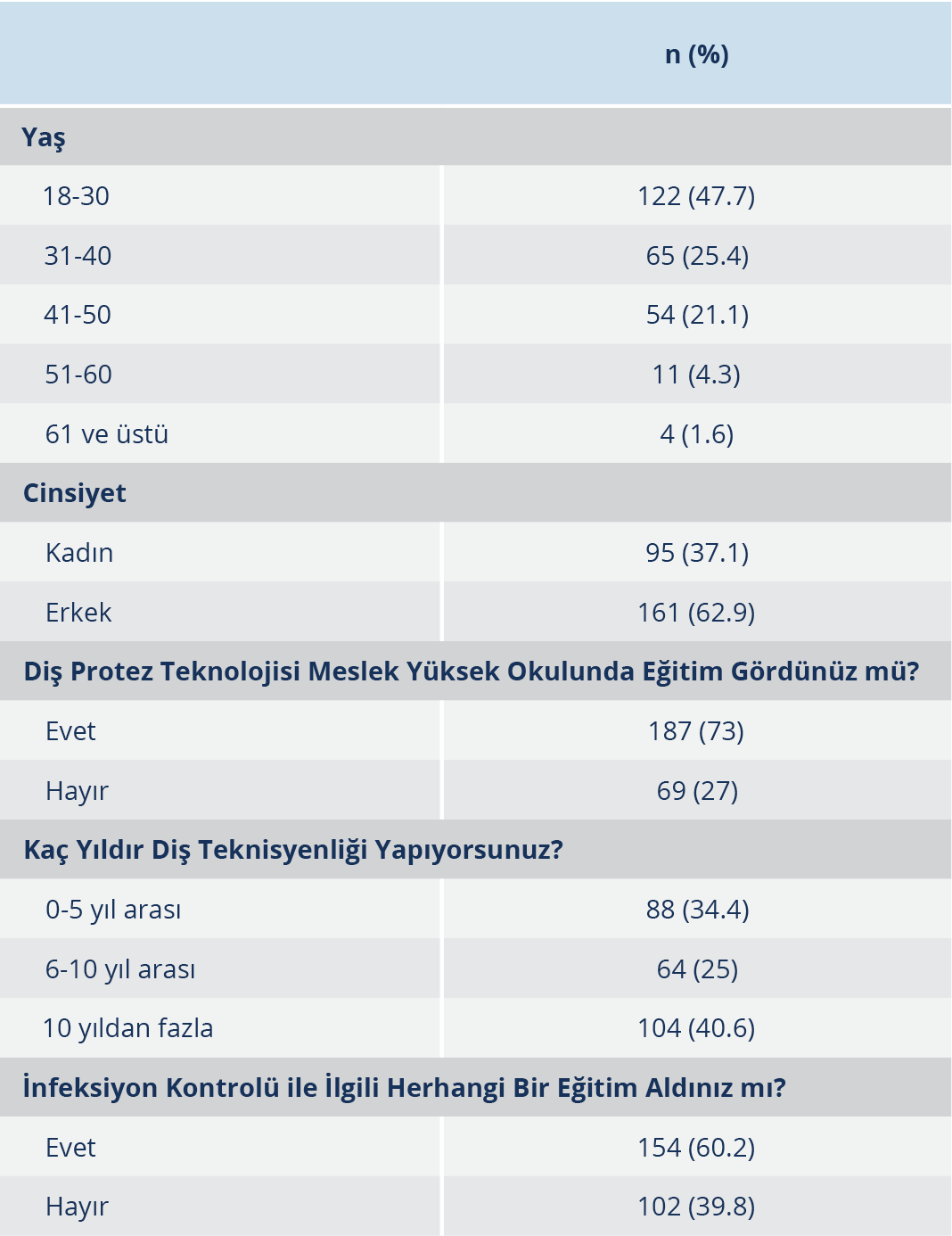 Anket sorularını 256 teknisyen yanıtlamış olup %73’ü diş protez teknolojisi meslek yüksek okulunda eğitim görmüştü; infeksiyon kontrolü eğitimi alanların oranı %60.2 idi. Katılımcıların yaş, cinsiyet, mesleki tecrübe ve eğitim bilgilerini içeren demografik veriler Tablo 1’de yer almaktadır. Laboratuvara gelen ölçü ve protezleri dezenfekte edenlerde; cinsiyet, mesleki tecrübe ve diş protez teknolojisi meslek yüksek okulunda eğitim görme açısından istatistiksel olarak anlamlı düzeyde bir farklılık görülmedi (p>0.05). Aljinat, silikon ve polieter ölçüler, tamir için gelen kullanılmış protezler ve laboratuvardaki biten işlerin diş hekimine gönderilmeden önce dezenfekte edilmesi ile ilgili olarak infeksiyon kontrolü eğitimi alanlar ile almayanlar arasında ise istatistiksel olarak anlamlı farklılık tespit edildi (p<0.001). Eğitim alan teknisyenlerin dezenfekte etme oranı eğitim almayanlardan anlamlı düzeyde yüksekti.