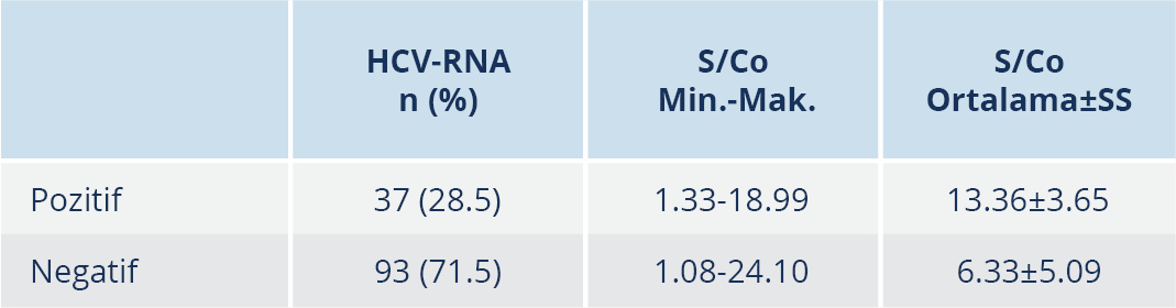 Anti-HCV reaktif olan 370 hastadan HCV-RNA sonuçlarına ulaşılabilen 130 hasta incelendiğinde, 37 (%28.5) hastanın HCV-RNA sonucu pozitif, 93 (%71.5) hastanın ise negatifti. Test sonucu HCV-RNA pozitif ve negatif olan hastaların S/Co değerleri karşılaştırıldığında, HCV-RNA pozitif hastalarda ortalama değer belirgin olarak yüksek tespit edildi; bu fark da istatistiksel olarak anlamlı düzeydeydi (p≤0.001) (Tablo 3).