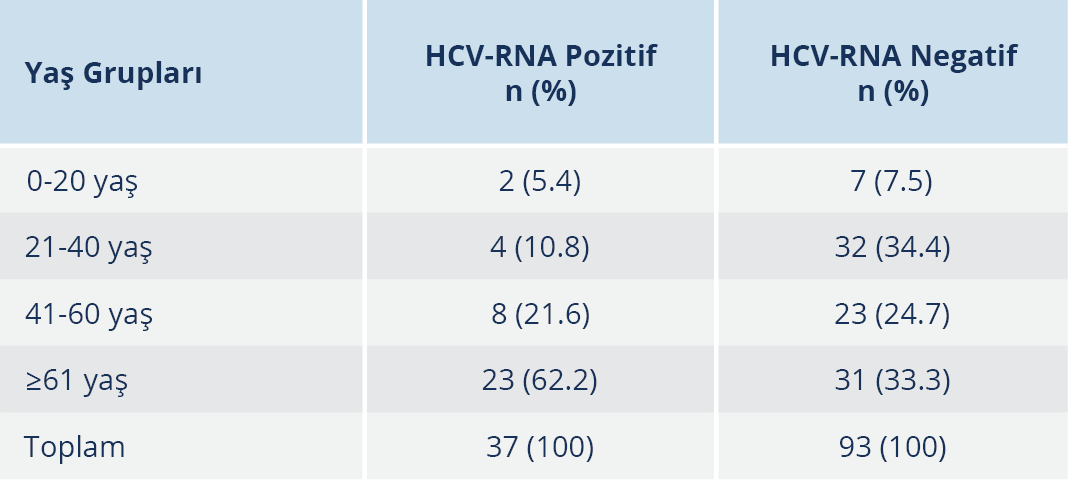 HCV-RNA pozitif hastaların, en fazla ≥61 yaş olan grupta (%62.2), en az ise 0-20 yaş grubunda (%5.4) bulunduğu görüldü. Yaş gruplarına göre HCV-RNA pozitifliği açısından istatistiksel olarak anlamlı düzeyde fark bulundu. Anti-HCV prevalansının da yaş ile arttığı düşünüldüğünde, HCV infeksiyonunun göstergesi olan HCV-RNA pozitifliğinin de yaş ile artması beklenen bir sonuçtur. Fakat bu verinin daha geniş kapsamlı çalışmalarla doğrulanması gerekmektedir.