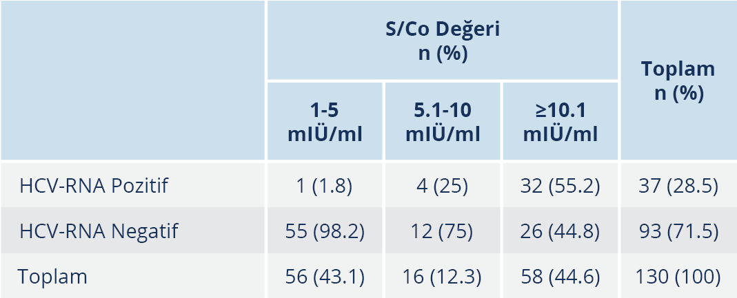 Anti-HCV reaktif hastalar S/Co değerlerine göre; 1-5 mIÜ/ml, 5.1-10 mIÜ/ml ve ≥10.1 mIÜ/ml olmak üzere üç grupta incelendi; S/Co değeri 1-5 mIÜ/ml olan 56 (%43.1) hasta, 5.1-10 mIÜ/ml olan 16 (%12.3) hasta ve ≥10.1 mIÜ/ml olan 58 (%44.6) hasta bulunmaktaydı (Tablo 5). S/Co değeri 1-5 mIÜ/ml arasında olan 56 hastanın sadece 1 (%1.8)’inde HCV-RNA pozitif saptanırken, S/Co değerinin 5.1-10 mIÜ/ml arasında olduğu grupta bu oran %25, S/Co değerinin ≥10.1 mIU/ml olduğu grupta ise %55.2 idi. Gruplar arasındaki bu fark istatistiksel olarak da anlamlı düzeydeydi (p≤0.001).