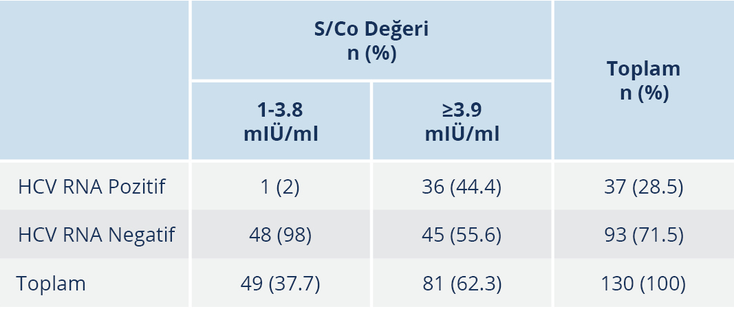 Bulgular: Literatürdeki veriler doğrultusunda bizim çalışmamızda da anti-HCV reaktif hastalar S/Co değerlerine göre 1.0-3.8 mIÜ/ml ve ≥3.9 mIÜ/ml olmak üzere iki gruba ayrıldı; birinci gruptaki hastaların sadece %2’sinde HCV-RNA pozitifliği saptanırken, ikinci grupta bu oranının %44.4 olduğu görüldü. Hastalar, S/Co değerlerine göre 1-5 mIÜ/ml, 5.1-10 mIÜ/ml ve ≥10.1 mIÜ/ml olmak üzere üç gruba ayrıldığında; S/Co değeri 1-5 mIÜ/ml arasında olan 56 hastanın sadece %1.8’inde HCV-RNA pozitifliği saptanırken, S/Co değerinin 5.1-10 mIÜ/ml arasında olduğu grupta bu oran %25, S/Co değerinin ≥10.1 mIÜ/ml olduğu grupta ise %55.2 idi. Her iki kategoride de gruplar arasındaki fark istatistiksel olarak anlamlı düzeyde bulundu.