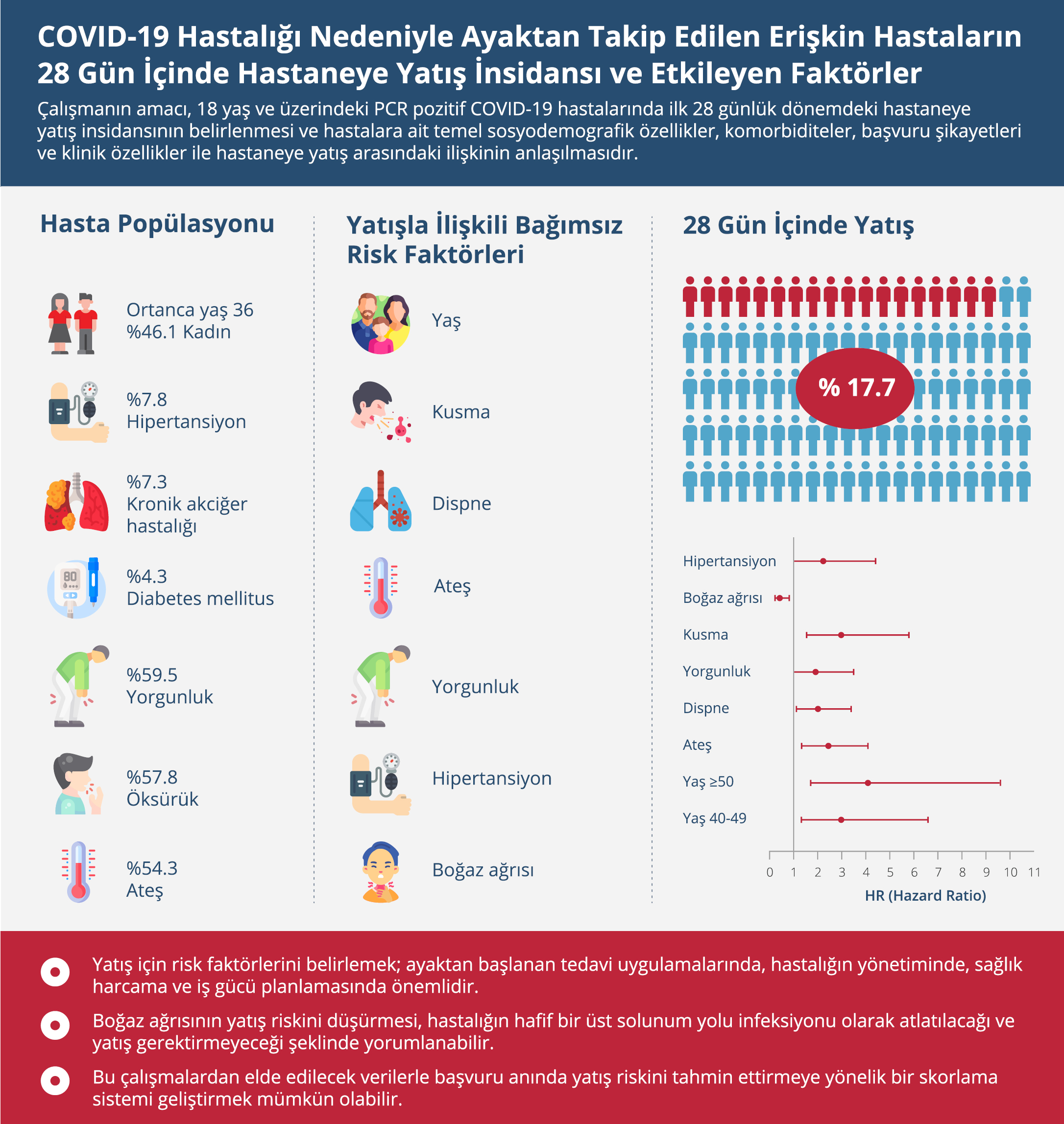 Çalışmamızda, COVID-19 tanısı ile hastaneye başvurup, ayaktan takip edilen hastaların 28 günlük izlem sırasında hastaneye yatış insidansı ve yatışlarına etki eden faktörler araştırıldı. Hastaneye 28 günlük yatış insidansı %17.7 olup yatışı etkileyen bağımsız risk faktörleri başvuru anında ateş, nefes darlığı, yorgunluk/bitkinlik, kusma ve boğaz ağrısı, hipertansiyon varlığı ve ileri yaş olarak saptandı.