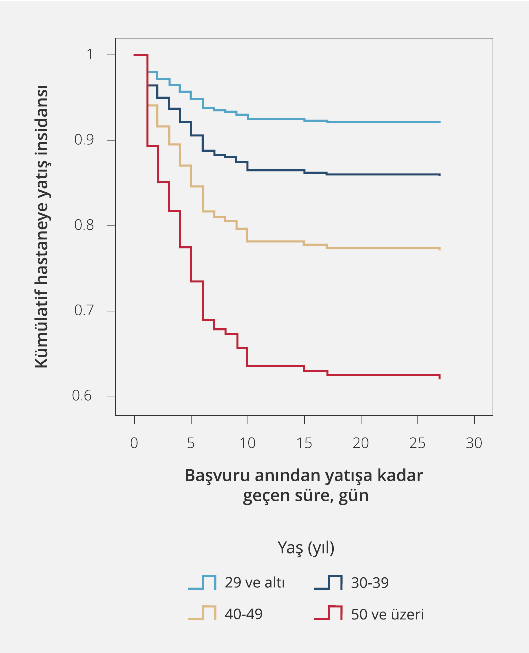 Bulgular: Çalışmaya 368 hasta dahil edildi. Ortanca (25.-75. persantil) yaşı 36 (28-45) yıl olarak saptanan hastaların %46.1’i kadındı. İlk 28 günde hastaneye yatış 65 (%17.7) hastada gerçekleşti. Çok değişkenli analizde ≤29 yaş referans alındığında; ≥50 yaş [HR=4.1, %95 güven aralığı (GA)=1.7-9.6], 40-49 yaş (HR=3.0, %95 GA=1.3-6.6) ve 30-39 yaş (HR=1.6, %95 GA=0.6-3.6), başvuru anında ateş ve/veya üşüme titreme (HR=2.3, %95 GA=1.3-4.1), nefes darlığı (HR=2.0, %95 GA=1.1-3.4), yorgunluk/bitkinlik (HR=1.9, %95 GA=1.0-3.5), kusma (HR=3.0, %95 GA=1.5-5.8) ve boğaz ağrısı (HR=0.4, GA=0.2-0.8) hastaneye yatışın bağımsız belirleyicileri olarak saptandı. Hipertansiyon varlığı (HR=2.2, %95 GA=1.0-4.4) yatışı öngördüren tek komorbidite olarak belirlendi.