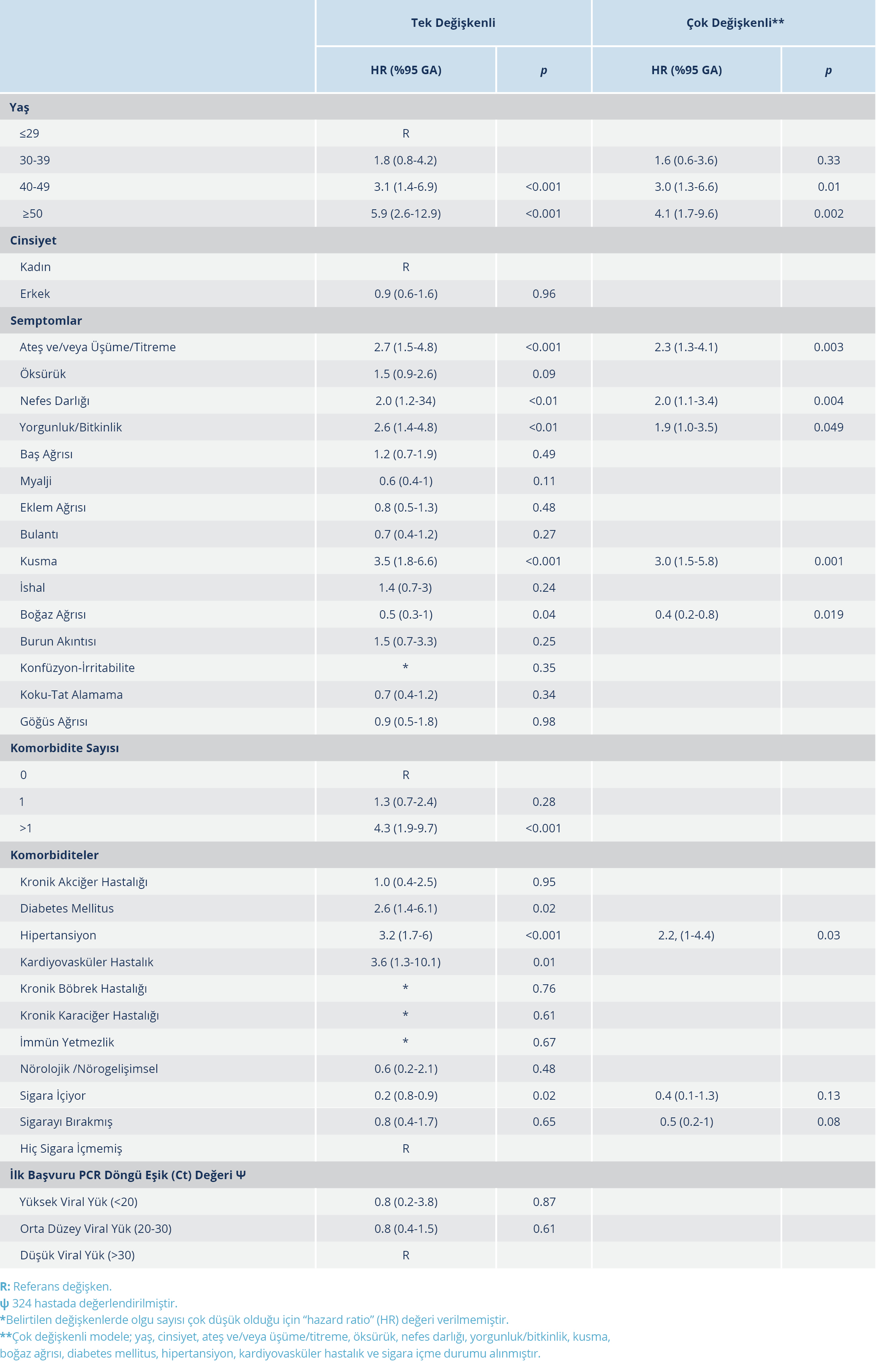 İlk 28 gün içinde hastaneye yatışa neden olan faktörler tek değişkenli analizle değerlendirildi. Bu analizde, ≤29 yaş referans alındığında hastaneye yatış riskinin; 30-39 yaş aralığında (HR=1.8, %95 GA=0.8-4.2), 40-49 yaş aralığında (HR=3.1, %95 GA=1.4-6.9) ve ≥50 yaş kategorisinde (HR= 5.9, %95 GA=2.6-12.9) artmış olduğu tespit edildi. Ateş ve/veya üşüme/titremesi olan hastalarda hastaneye yatış riski (HR=2.7, %95 GA=1.5-4.8) olmayanlara göre daha yüksekti. Boğaz ağrısı olan hastalarda ise hastaneye yatış riski (HR=0.5, %95 GA=0.3-1.0) olmayanlara göre daha düşük bulundu. Komorbiditesi olan hastalarda hastaneye yatış riski (HR=1.7, %95 GA=1.0-2.8) komorbiditesi olmayanlara göre anlamlı düzeyde daha yüksekti (p=0.02). Komorbiditeler ayrı ayrı incelendiğinde; diabetes mellitus (DM) (HR=2.6, %95 GA=1.4-6.1), hipertansiyon (HT) (HR=3.2, %95 GA=1.7-6.0) ve kardiyovasküler hastalık (HR=3.6, %95 GA=1.3-10.1) varlığının hastaneye yatış riskini artırdığı saptandı (Tablo 2).