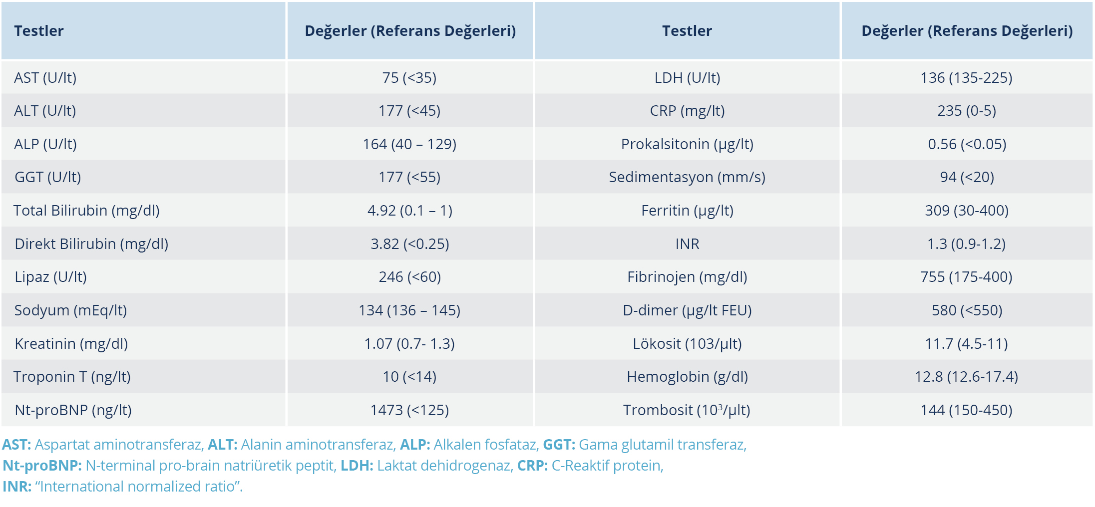 Acil servise ateş yüksekliği, halsizlik, iştahsızlık, karın ağrısı, idrar renginde koyulaşma şikayetleri ile başvuran 40 yaşında erkek hastanın anamnezinde; evli olduğu, tavuk çiftliğinde çalıştığı, bilinen hastalık öyküsü olmadığı, şikayetlerinin altı gündür devam ettiği ve başvuru öncesinde başka bir merkezde kolesistit ön tanısıyla siprofloksasin ve metronidazol başlandığı tespit edildi. Son altı ayda seyahat, şüpheli cinsel ilişki, böcek ısırığı, mantar, taze süt ve peynir yeme öyküsü olmadığını belirten hastanın fizik muayenesinde; kan basıncı 96/65 mmHg, kalp hızı 92 /dakika (ritmik ve üfürümü yok), vücut sıcaklığı 38.9 °C, satürasyonu %93, solunum sayısı 31/dakika olarak izlendi. Karın cildinde açık pembe renkli 1-2 cm çapında basmakla solan döküntüleri mevcuttu. Batın muayenesinde sağ ve orta kadranda hassasiyet tespit edildi. Karaciğer kot altında 3 cm ele geliyordu, traube alanı kapalıydı. Akciğer oskültasyonunda bazallerde bilateral raller duyuldu. Diğer sistem muayeneleri ise normal olarak değerlendirildi. Laboratuvar incelemelerinde, transaminaz ve bilirubin yüksekliği tespit edildi (Tablo 1). Akut faz reaktanları yüksek saptandı. İlk değerlendirmede bakılan troponin değeri normal sınırlardaydı ve hasta mevcut laboratuvar bulguları, sınırda kan basıncı düşüklüğü ve takipnesi sebebiyle iç hastalıkları yoğun bakım ünitesine yatırıldı. Akciğer grafisinde kardiyotorasik oran (KTO) artışı gözlendi ve pnömonik infiltrasyon izlenmedi. Elektrokardiyografi (EKG)’sinde normal sinüs ritmi vardı ve hız 105/dakika idi; ST-T değişikliği izlenmedi. Batın ultrasonografik incelemesinde hepatosplenomegali saptandı; safra yolları normal olarak izlendi. Tüm vücut bilgisayarlı tomografide sıvama tarzında plevral efüzyon ve hepatosplenomegali dışında patoloji saptanmadı. Kolesistit ve kolanjit ön tanıları ile acil serviste başlanmış olan seftriakson tedavisine devam edildi. Viral hepatit belirteçleri negatif sonuçlandı. Hastanın takibinde hipotansif seyir gözlendi. Elektrokardiyografi değişikliği göstermeyen hastada KTO artışı ve kalp yetmezliği bulguları nedeniyle takip edilen troponin değerlerinde artma izlendi ve miyokardit ön tanısı ile transtorasik ekokardiyografi (TTE) istendi. Minimal perikardiyal efüzyon ve parlaklık artışı, mitral ve aort kapaklarında hafif kalın dejeneratif görünüm ve sol ventrikülde hafif duvar kalınlaşması izlendi. Miyokardit etyolojisi için ateşli dönemde alınan kan kültüründe mikroorganizma üremedi. Rose Bengal testi negatif olarak sonuçlandı. Rubella, kist hidatik, Leishmania, sitomegalovirus ve Epstein-Barr virus serolojileri negatif sonuçlandı. Hastanın mesleği ve hayvan teması nedeniyle leptospiroz ve Coxiella serolojileri T.C. Sağlık Bakanlığı Halk Sağlığı Genel Müdürlüğü Mikrobiyoloji Referans Laboratuvarı’na gönderildi.