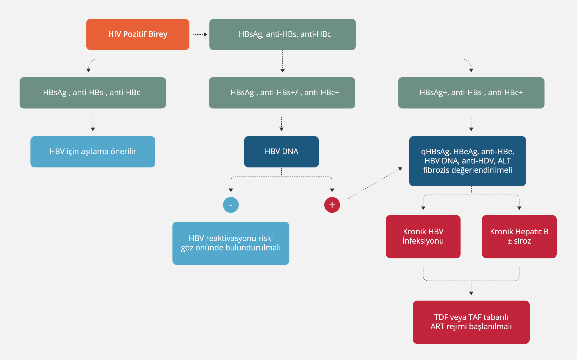 Bulaşma yolu aynı olduğu için HIV ile infekte olan tüm bireyler, HBV [HBsAg pozitifliği olan bireylerde hepatit Delta virusu (HDV), anti-HDV] ve HCV için test edilmelidir; bunun tersi de geçerlidir. Anti-HBs pozitifliği olan HIV pozitif hastalarda HBV serolojik testleri tekrarlanmalıdır. Anti-HBc, geçmişte HBV infeksiyonu geçirmiş olması nedeniyle HIV pozitif hastalarda da bulunabilir.
