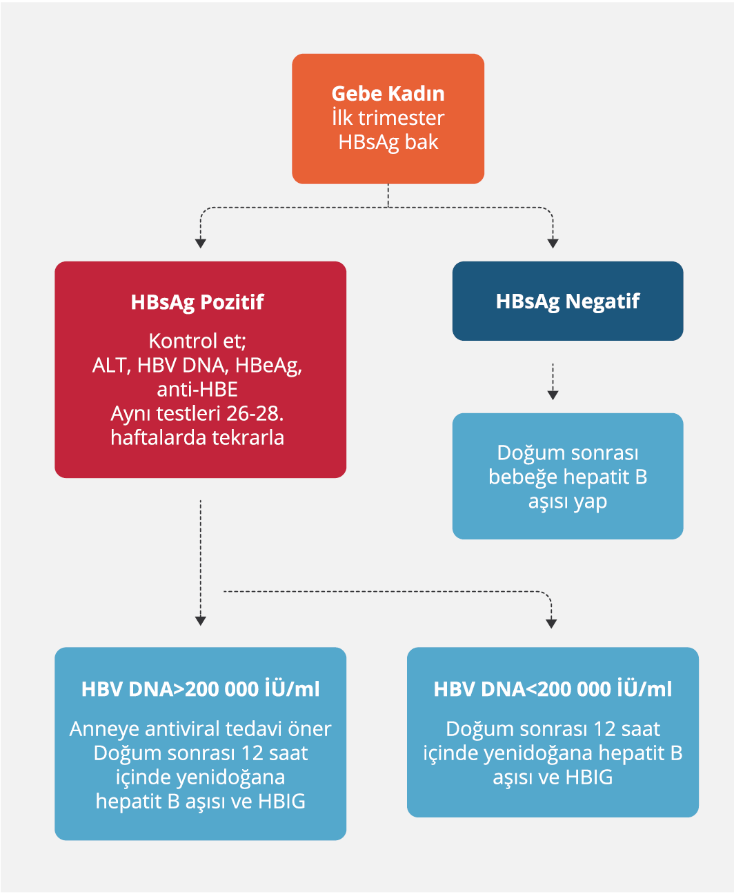 İlk başvuruda gebenin HBsAg testi pozitif olarak sonuçlanmışsa, HBeAg, anti-HBe, HBV DNA, serum ALT düzeyleri de tespit edilmeli ve hastalığın şiddeti, diğer viral hastalıkların varlığı gibi ek sağlık durumları bilinmelidir. KHB infeksiyonu olan gebede serum HBV DNA ve ALT düzeyleri üç ayda bir ve üçüncü trimesterin sonuna doğru bakılmalıdır (62).
