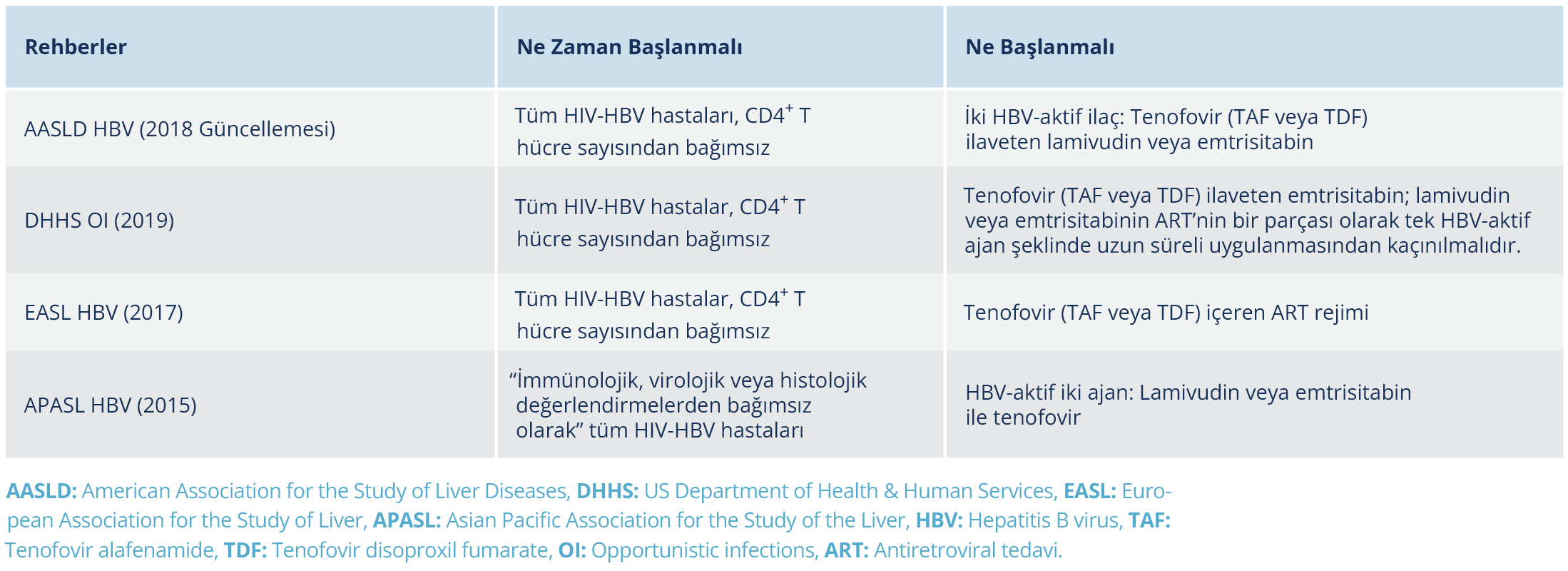 HIV/HBV koinfeksiyonu olan tüm hastalar tenofovir intoleransı yoksa tenofovir disoproksil fumarat (TDF) veya 2016’da onaylanan bir tenofovir formülasyonu olan tenofovir alafenamid fumarat (TAF) içeren antiretroviral tedavi (ART) almalıdır. Hepatit B’ye etkili ART alan HIV/HBV koinfekte hastalarda hepatik alevlenme ve HBV reaktivasyonu sonrası dekompanzasyon riskinden dolayı tedavi kesilmesinden kaçınılmalıdır (33,34).