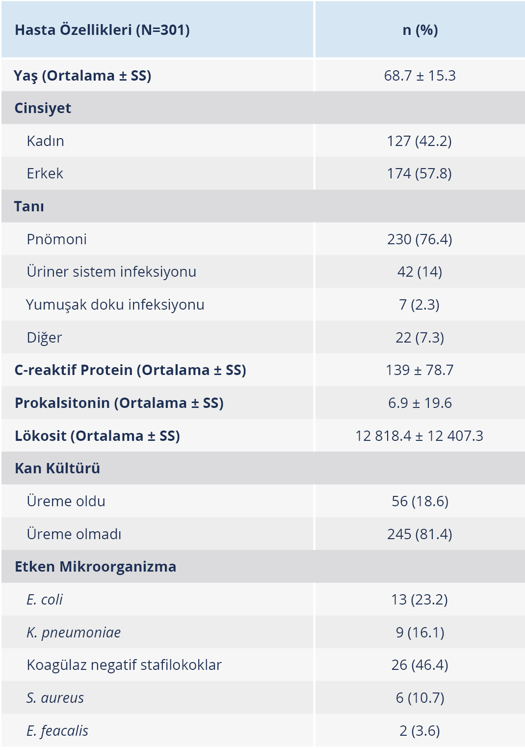 Acil servise ateş şikayetiyle başvuran 4036 hasta incelendi ve kriterlere uygun olan 174 (%57.8)’ü erkek, 127 (%42.2)’si kadın olmak üzere toplam 301 hasta çalışmaya dahil edildi. Hastaların yaşları 19 ile 95 arasında değişirken, medyan yaş 71 idi. Değerlendirmeye alınan hastaların 245 (%81.4)’inin kan kültüründe üreme görülmezken, 56 (%18.6)’sında üreme olduğu saptandı. Çalışmaya alınan hastalarda %76 oranıyla en sık olarak pnömoni tanısı tespit edildi. Hastaların klinik ve laboratuvar özellikleri Tablo 1’de verildi. Bakteriyemisi olan ve olmayanlar karşılaştırıldığında, kültürde üreme olan hastalar belirgin olarak daha yaşlı idi. Lökosit sayısı, CRP ve PCT değerleri bakteriyemisi olan grupta istatistiksel açıdan belirgin olarak daha yüksek saptandı (Tablo 2).