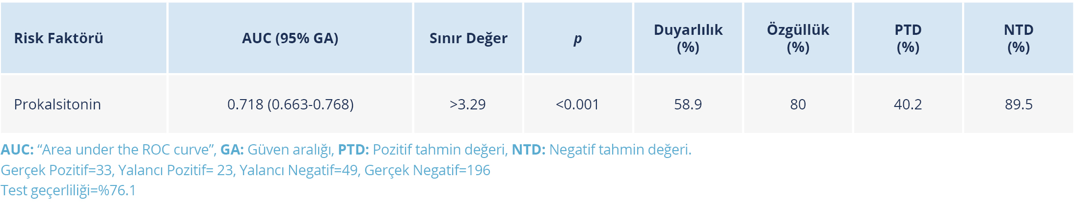 Hastaların lökosit değerleri ile PCT değerleri arasında düşük düzeyde pozitif korelasyon olduğu görüldü (r=0.373, p<0.001). Benzer şekilde CRP değerleri ile PCT değerleri arasında da düşük düzeyde pozitif korelasyon tespit edildi (r=0.490, p<0.001). Prokalsitoninin özgüllüğü %80 ve NTD %89.5 olarak saptandı (Tablo 3). Prokalsitonin değeri ≥3.29 ng/ml olan hastaların 33 (%39.8)’ünde bakteriyemi var iken <3.29 ng/ml olan hastaların sadece 23 (%10.6)’ünde bakteriyemi olduğu tespit edildi (p<0.05). Prokalsitonin sonucu için eğri altından kalan alan (“area under the ROC curve” – AUC) 0.718 olarak bulunurken, eşik değerinin 3.29 olduğu saptandı. Bakteriyemide, PCT tanı testi için bulunan değerin orta düzeyde (%70-%80) ayırma yeteneği olduğu belirlendi (Şekil 1).