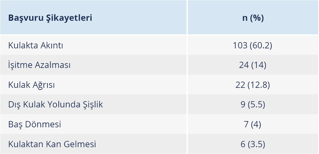 Otitis eksternada en sık olarak tragus ve/veya kulak kepçesi üzerine baskı ile artan şiddetli ağrı görülür. İşitme azalması, kaşıntı ve kulak akıntısı diğer semptomlardır. Şiddetli bakteriyel otitis eksternada dış kulak yolunun tamamen kapanması sonucunda kulak kepçesinde ödem görülebilir. Kronik süpüratif otitis medianın semptomları arasında ise kulak akıntısı, ağrı, işitme azalması, dengesizlik ve baş dönmesi bulunmaktadır (23). Çalışmamızdaki hastalarda en sık görülen başvuru şikayetleri kulak akıntısı (%60.2) ve kulak ağrısı (%12.8) idi.